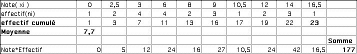 E-Bahut Barbidoux Posté(e) le 23 février 2010 E-Bahut Signaler Posté(e) le 23 février 2010 Voici les notes à un devoir commun des 23 éleves de Seconde A . 0- 12 - 9 - 10,5- 2,5- 8 - 3 -8- 3- 14 - 6- 2,5 - 6- 16,5-14 - 6- 9- 3 - 6 -14- 12 - 3- 9. On se propose de ranger ces valeurs dans un tableau : Note( xi ): 0- 2,5- 3- 6- 8- 9- 10,5- 12- 14 -16,5 effectif(ni): 1- 2 - 4 - 4- 2 - 3- 1 - 2- 3 - 1 1) Donner la moyenne . La moyenne vaut (somme des produits de la note par l'effectif/ effectif total) soit (0*1+2,5*2+3*4.......+16.5*1)/23=177/23=7,7 2) donner la Médiane la médiane qui correspond à la moitié de l'effectif soit 11,5=11 élèves se situe entre les notes 6 et 8 3) La représentation graphique ( C'est a dire : diagramme en bâton )