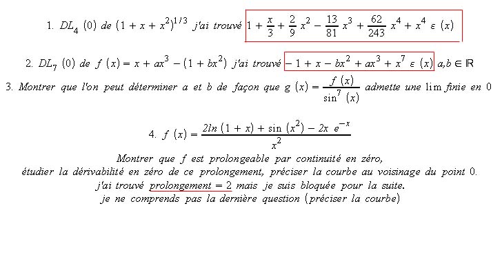 philippe Posté(e) le 10 novembre 2003 Signaler Posté(e) le 10 novembre 2003 on est d'accord pour le DL de (1+sin(x)) 1. DL de (1+x+x²)^(1/3) : je trouve 8/243 au lieu de 62/243 2. le suivant: ok aussi 3. par contre, c'est bien f(x)/sin(x)^7? 4. on peut définir le prolongement par: f*(x)= f(x) si x<>0 et 2 si x=0 dérivabilité en 0: (revenir à la définition) étudie la limite en 0 (DL...) de : [f(x)-f(0)]/(x-0)=[f(x)-2]/x tu trouveras -1/3. (au voisinage de 0), f(x)=2-x/3+o(x) équation de la tangente en 0: y=2-x/3 (si tu pousses le DL plus loin: f(x)=2-x/3-x²/6+o(x)) j'espère que ça ira