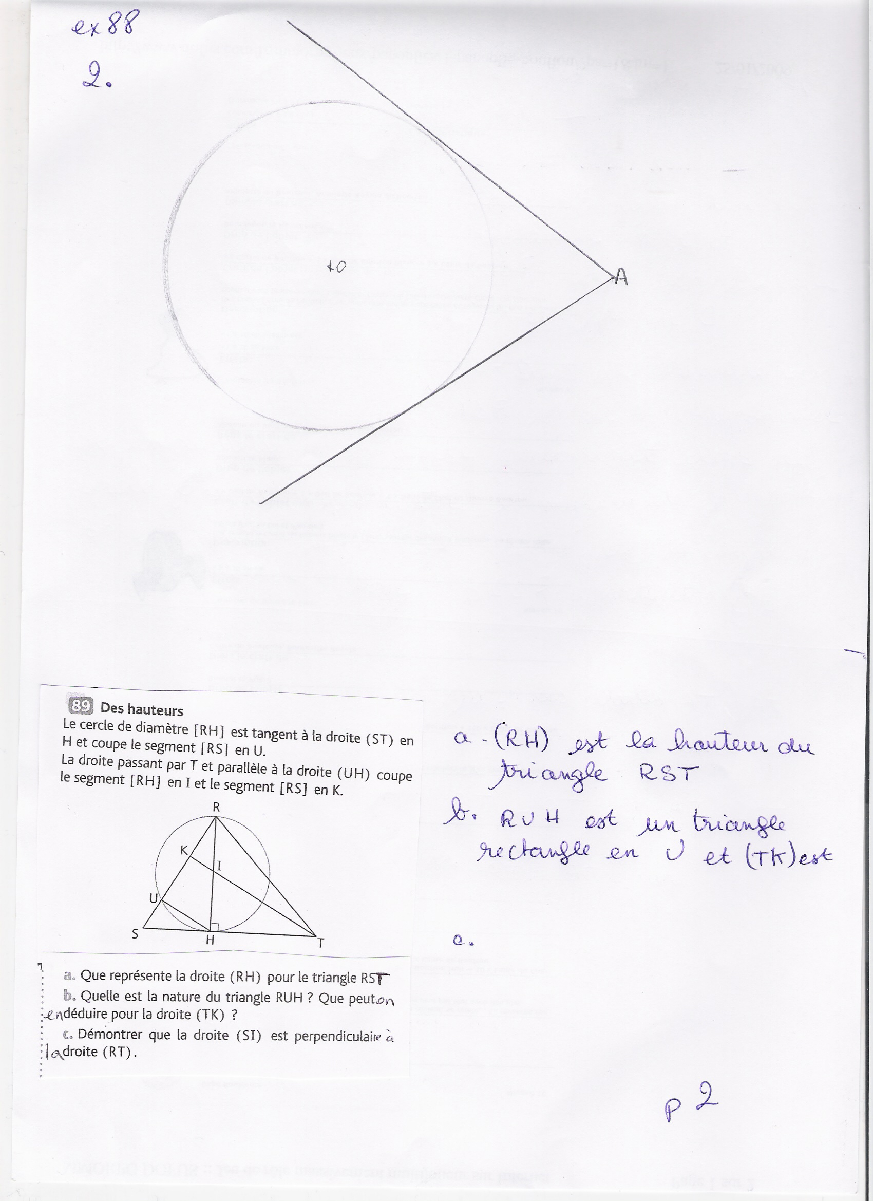 E-Bahut Barbidoux Posté(e) le 2 mars 2010 E-Bahut Signaler Posté(e) le 2 mars 2010 Exo 89----------------- c) TK est parallèle à UH qui est perpendiculaire à RU. C'est donc une hauteur du triangle RTS. I est l'orthocentre de ce triangle (point de concours des hauteurs) et SI la troisième hauteur du triangle est perpendiculaire à RT