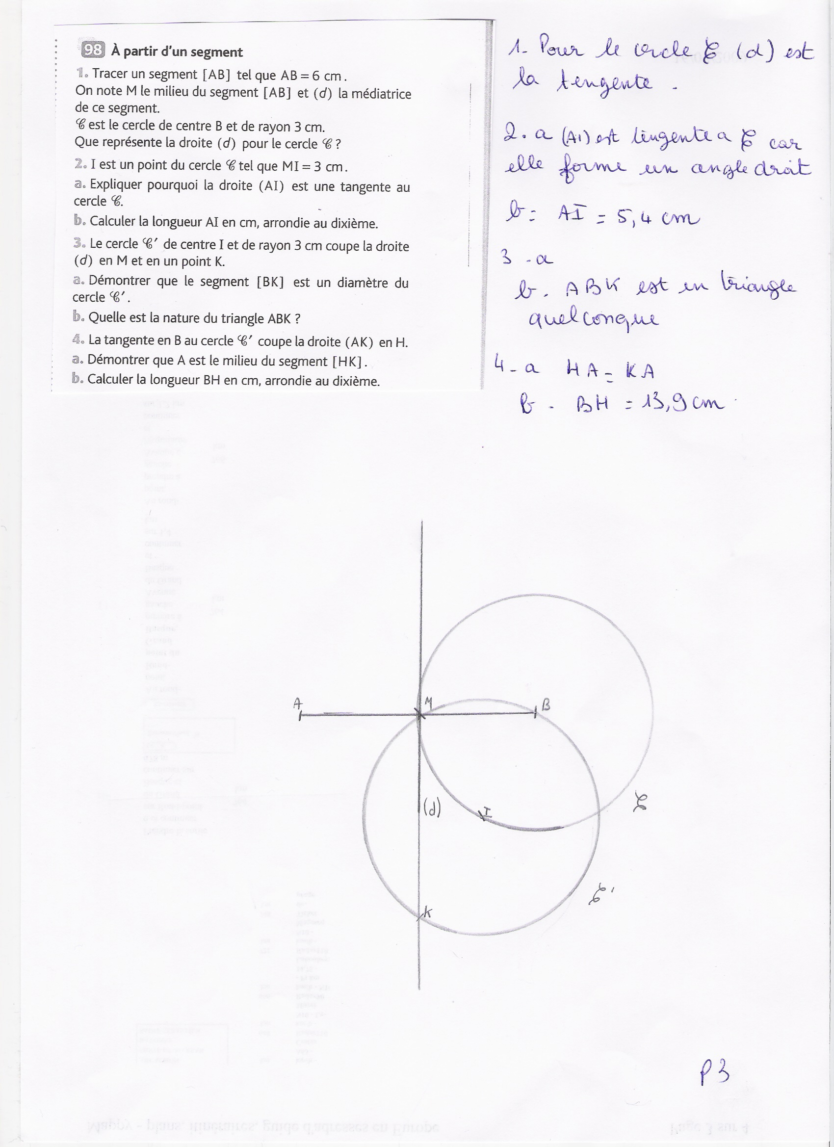 E-Bahut Barbidoux Posté(e) le 2 mars 2010 E-Bahut Signaler Posté(e) le 2 mars 2010 Exo 98----------------- 2a--------- MI=3 cm ==> I est situé sur le cercle de centre M et de rayon MI. Le triangle ABI est inscrit dans un cercle ayant pour diamètre un de ses côté il est donc rectangle en I. 2b--------- Théorème de Pythagore dans le triangle AIB ==> AI=√(AB^2-BI^2)=√(6^2-3^2)=5,196=5,2 3a--------- Le triangle BMK est rectangle en M donc inscrit dans un cercle C' dont le diamètre est BK. 3b--------- Le triangle ABK est équilatéral BK+BA+6 cm et K situé sur la médiatrice de AB ==> AK=BK 4---------- BK est perpendiculaire à BH et le triangle KBH est rectangle en B donc inscrit dans un cercle de diamètre HK. Le centre de ce cercle est situé sur la médiatrice de BK c'est donc le point A et AH=AK=AB=6 cm Pythagore dans le triangle KBH ==> BH=√(KH^2-BK^2)=√(12^2-6^2)=10,39=10,4