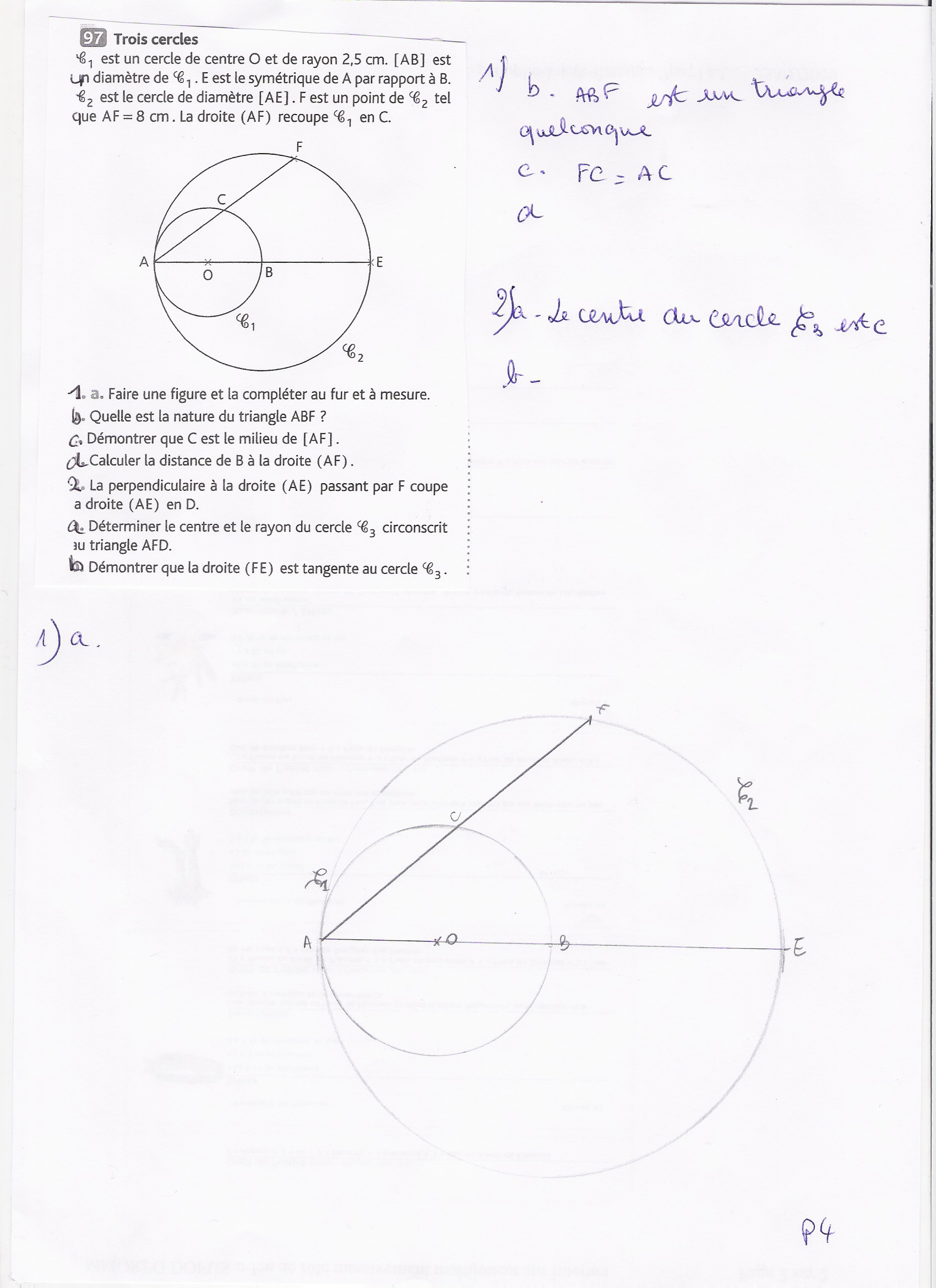 E-Bahut Barbidoux Posté(e) le 3 mars 2010 E-Bahut Signaler Posté(e) le 3 mars 2010 76---------------------- Le triangle BAE est inscrit dans le cercle C1 de diamètre BA ==> EBA est rectangle en E ==> BE est donc perpendicuaire à EF Le triangle ACF est inscrit dans le cercle C2 de diamètre AF ==> ACF est rectangle en C ==> CB est donc perpendicuaire à CF ------------------------- Les triangles rectangles BEF et BCF repectivement rectangles en E et en C sont inscrit dans un cercle C3 de diamètre BF. Le centre de ce cercle est le milieu de BF. O1 étant le milieu AB; O2 celui de AF ==> AO1/AB=AO2/AF=O1O2/BF=1/2 et BF/2=O1O2 est le rayon du cercle C3