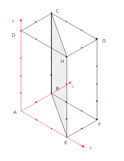 E-Bahut Barbidoux Posté(e) le 7 mars 2010 E-Bahut Signaler Posté(e) le 7 mars 2010 On considère le pavé droit ABCDEFGH : AB=2, AD=5 et AE=3. Les points I,J et K, respectivement sur (AB), (AD) et (AE), sont tels que AI=AJ=AK=1. Nous choisissons le repère R = ( A; AI,AJ,AK), ( AI) est l'axe des abscisses, (AJ) des ordonnées et (AK) celui des cotes. 1) Démontrer que le plan ( EHCB) est parallèle à la droite (AD). Les points A et D n'appartenant pas au plan EHBC, la droite AD étant parallèle à CB ==> la droite AD est parallèle au plan EHBC 2) Dans le repère ( A;AI,AK), calculez une équation de la droite (BE). Déduisez-en une équation du plan (EHCB) dans le repère R . l'équation générale réduite de la droite BE dans le plan EHCB s'exprime par z=a*x+b où a et b sont des constantes dont on détermine la valeur en écrivant que la droite passe par B{2,0} et {E{0,3} ==> 2*a+b=0 et b=3 ==> a=-3/2 ==> z=-3*x/2+3 ou 2*z+3*x-6=0 ce qui est aussi l'équation du plan ECBH dans l'espace