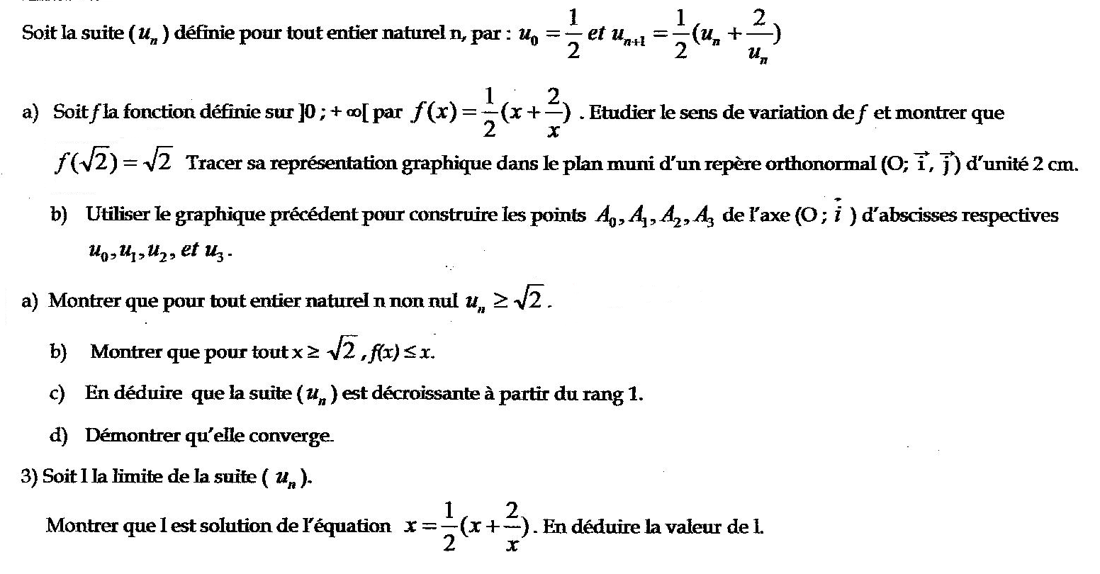 keitsha Posté(e) le 16 mars 2010 Signaler Posté(e) le 16 mars 2010 Bonjour, J'ai rencontré certains problèmes quant à la réalisation de cet exercice Je bloque sur f(racine2)=racine2 Je pense pour la question 2)a) devoir répondre par récurrence mais je bute sur l'étude de l'hédité et donc, sur la suite de l'exercice... Merci d'avance !