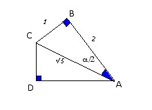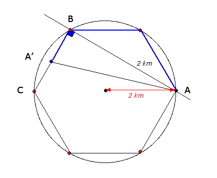 E-Bahut Barbidoux Posté(e) le 24 avril 2010 E-Bahut Signaler Posté(e) le 24 avril 2010 69------------------ Ce qu’il faut savoir : - un hexagone est inscrit dans un cercle ayant pour rayon un de ses côtés - un triangle rectangle est inscrit dans un cercle ayant pour diamètre son hypothénuse. ---------------------- Après avoir parcouru 5 km en partant de A Alice se trouve en A’ Le triangle ABC est rectangle en B==> Pythagore AC^2=AB^2+BC^2 ==> AB=√(AC^2-BC^2)=√(4^2-2^2)=√12)=2√3 Le triangle ABA’ est rectangle en B==> Pythagore AA’^2=AB^2+BA’^2 ==> AA’=√(AB^2+BA’^2 )=√(12+1))=√13 69------------------ Ce qu’il faut savoir : exprimer le sin et le cos d’un angle dans un triangle rectangle exprimer le sinus d’un angle double : sin(2*a)=2*sin(a)*cos(a) ---------------------- Dans le triangle CBA rectangle en B ==> Pythagore ==> CA=√(CB^2+BA^2)=√(1+4)=√5 Sin(a/2)=1/√5 et Cos(a/2)=2√5 ==> Sin(a)=2*sin(a/2)*cos(a/2)=2*(1/√5)*(2/√5)=4/5