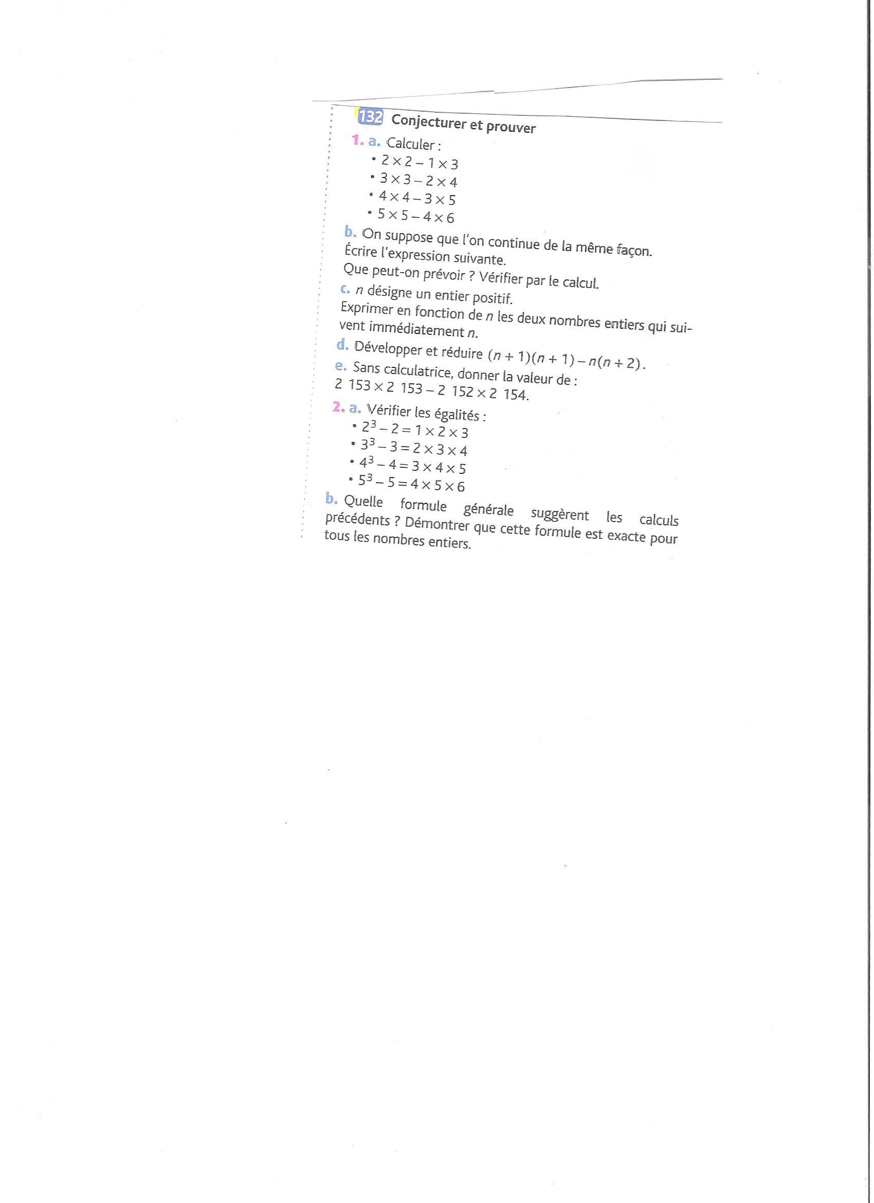fatifree Posté(e) le 29 avril 2010 Auteur Signaler Posté(e) le 29 avril 2010 merci beaucoup je commence à comprendre j'ai fait un autre exo pouvez vous me dire si ce que j'ai fait est juste et m'aider pour le 2.b Cela ressemble aux 2 autres exos d'avant. 1a. 2*2-1*3=4-3=1 3*3-2*4=9-8=1 4*4-3*5=16-15=1 5*5-4*6=25-24=1 1b. 6*6-5*7=36-35=1 J'en conclus que le résultat est toujours 1 1c. n-1 et n+1 1d. (n+1)(n+1)-n(n+2) =n2+1n+1n+1-n2-2n =1 1e. =1 2a. 23--2=1*2*3 6=6 33-3=2*3*4 24=24 43-4=3*4*5 60=60 53-5=4*5*6 120=120