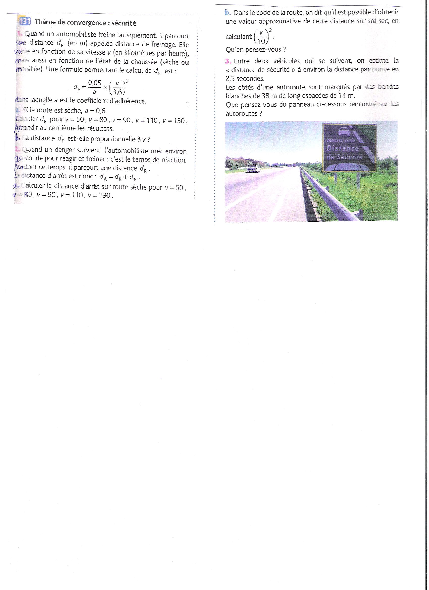 fatifree Posté(e) le 1 mai 2010 Signaler Posté(e) le 1 mai 2010 Bonjour, voici le dernier exo je bloque à partir du 2 Voici ce que j'ai fais pour le 1a. Pour v =50 df=0.05/0.6*(50/3.6)2=0.05/0.6*2500/12.96=125/7.76=16.075 pour v =80 df=0.05/06*(80/3.6)2=0.05/0.6*6400/12.96=320/7.776=41.152 pour v =90 df=31.25 pour v= 110 df=46.682 pour v=130 df=65.200 1b. Oui la distance df est proportionnelle à v car df = environ 2*v 2. La je cale, je connais df mais comment trouver dr? merci pour votre aide