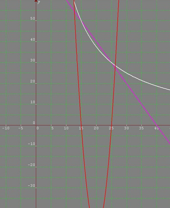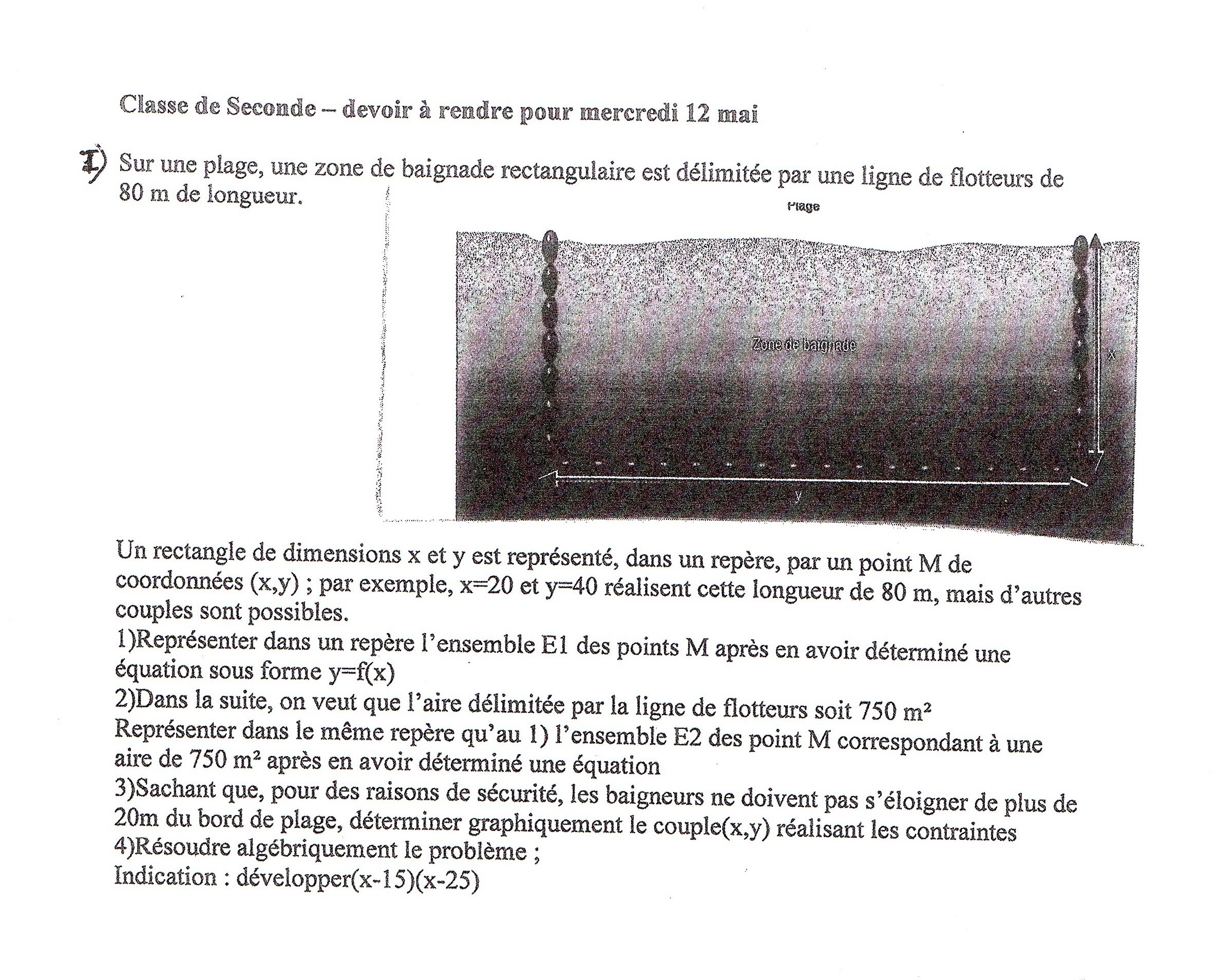 E-Bahut Denis CAMUS Posté(e) le 5 mai 2010 E-Bahut Signaler Posté(e) le 5 mai 2010 Bonsoir, 1) Si on connait la valeur de x, que vaut y pour que la corde mesure 80m ? 2) Quel est le calcul à faire avec x et y pour calculer l'aire de baignade ? 3) Juste à lire sur le graphique en face de x=20 4) Tu utilises l'expression de y servant à calculer l'aire de 750m2, et tu reporte cette expression dans l'expression de la longueur de la corde. Résous l'équation. Si tout va bien, tu trouves x=15 et x=25, mais une des deux valeurs ne remplit pas les contraintes données. Denis