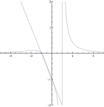 E-Bahut Barbidoux Posté(e) le 12 septembre 2010 E-Bahut Signaler Posté(e) le 12 septembre 2010 Fais attention... tu avais écrit f(x)=(x - 1)/(x^3 - 1).... f(x)=(x + 1)/(x^3 - 1) f’(x)= - 1/(x^3-1)-(3 x^2 (x+1))/(x^3-1)^2 f’(x)= -(2 x^3+3 x^2+1)/(x^3-1)^2 f’(x)= -(2 x^3+3 x^2+1)/((x-1)*(x^2+x+1) Trois polynômes à étudier.... ----------------- -(2 x^3+3 x^2+1). Polynôme du troisème degré on le met et sous la forme de z^3+p*z+q (méthode de Cardan) ==> -x^3-(3/2)x-1/2 et l’on calcule ∆=q^2+(4/27)p^3=(3/2)^(2)+(4/27)*(-1/2)^3>0 donc ce polynôme admet 1 racine réelle et 1 complexe. La valeur de la racine (recherchée par dichotomie) vaut ≈ -1,68 ----------------- x-1 negatif pour x<1 ----------------- (x^2+x+1) Polynôme du second degré. ∆>0 donc >0(du signe de x^2) Limites x-> ==> f(x)->0 x-> 1^+ ==> f(x)=2/0^(+) -> x->1^- ==> f(x) =2/0^(-) -> - Tableau de variation de la fonction .............................................-1.68............................1................................... f’(x)....................(+)...............(0)............(-)..............||.........(-)...................... f(x).................crois.............Max......decrois...........||......decrois........ L'équation de la tangente au point d'abscisse a au graphe de f(x) s'ecrit y=f'(a)*(x-a)+f(a) ==> y=-x-1 f(x)-y=(x + 1)/(x^3 - 1)+(x+1)=((x+1)+(x+1)*(x^3-1))/(x^3-1)=x^3*(x+1)/(x^3-1) f(x)-y ademet deux racines x=0 et x=-1 est est >0 entre les valeurs de ces racines ==> f(x) est au dessus de sa tagente dans l'intervalle ]-1, 0[