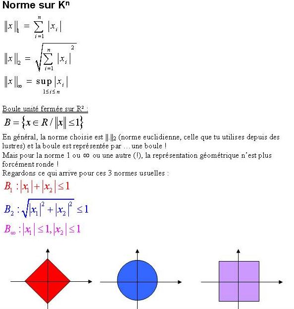 E-Bahut anne.bak Posté(e) le 23 novembre 2003 E-Bahut Signaler Posté(e) le 23 novembre 2003 voilà j'ai eu un cours de maths sur les normes 1,2, et infini mais je n'ai strictement RIEN compris !! selon le prof, un cercle peut être représenté par un carré si on utilise une certaine norme Je veux bien, mais là je plane un peu :P