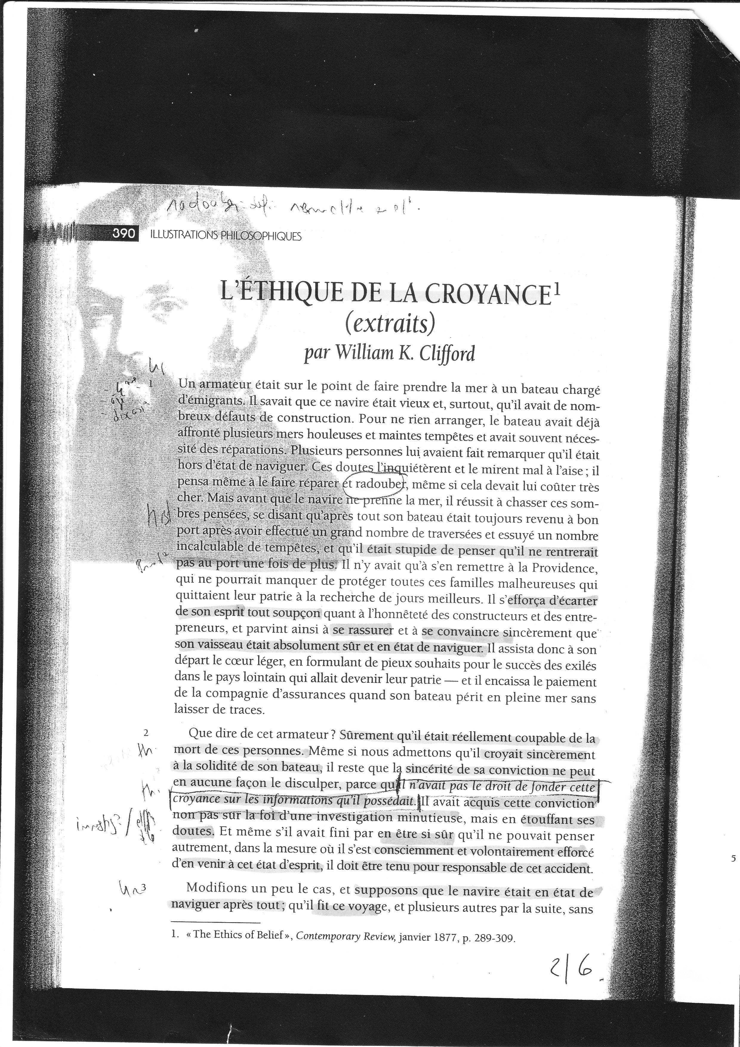 elo974 Posté(e) le 18 octobre 2010 Signaler Posté(e) le 18 octobre 2010 salut a tous! j'aurais besoin d'aide pour un devoir de philosphie c'est mon tout premier sur l'éthique des croyances en fet j'ai relu plusieurs mais je ne comprend pas les questions mais le texte je comprends svp pourriez vous m'aidez j'ai des idées mais je ne peux pas m'exprimer correctement dans un langage philosophique et sans fautes xd! j'aurais vraiment besoin d'un coup de main c'est très important c'est mon premier devoir de philo et j'aimerais pas me planter! vous me comprenai je ne comprend pas les questions qu'est ce que sa veut dire rationnellement? j'ai joint le texte et les questions... je sais le texte et long a lire mais vous pourriez faire cet effort de jetter un coup d'oeil pour une lycéenne en détrèse xd! et les questions aussi j'ai joint merci d'avance c'est très gentil merci de votre compréhension ! j'attends des réponses avec impatience! c assez urgent merci encore! vous pourriez répondre aux 6 questions svp je vous serrez trés reconnaisante merci! j'analyserais vos réponse et j'essayerais de comprendre! vous pouvez laissé votre adresse msn pour:blush: que vous m'expliquer si je n'ai pas compri ou votre facebook merci d'avance bonne soirée a tous et merci a vous tous!