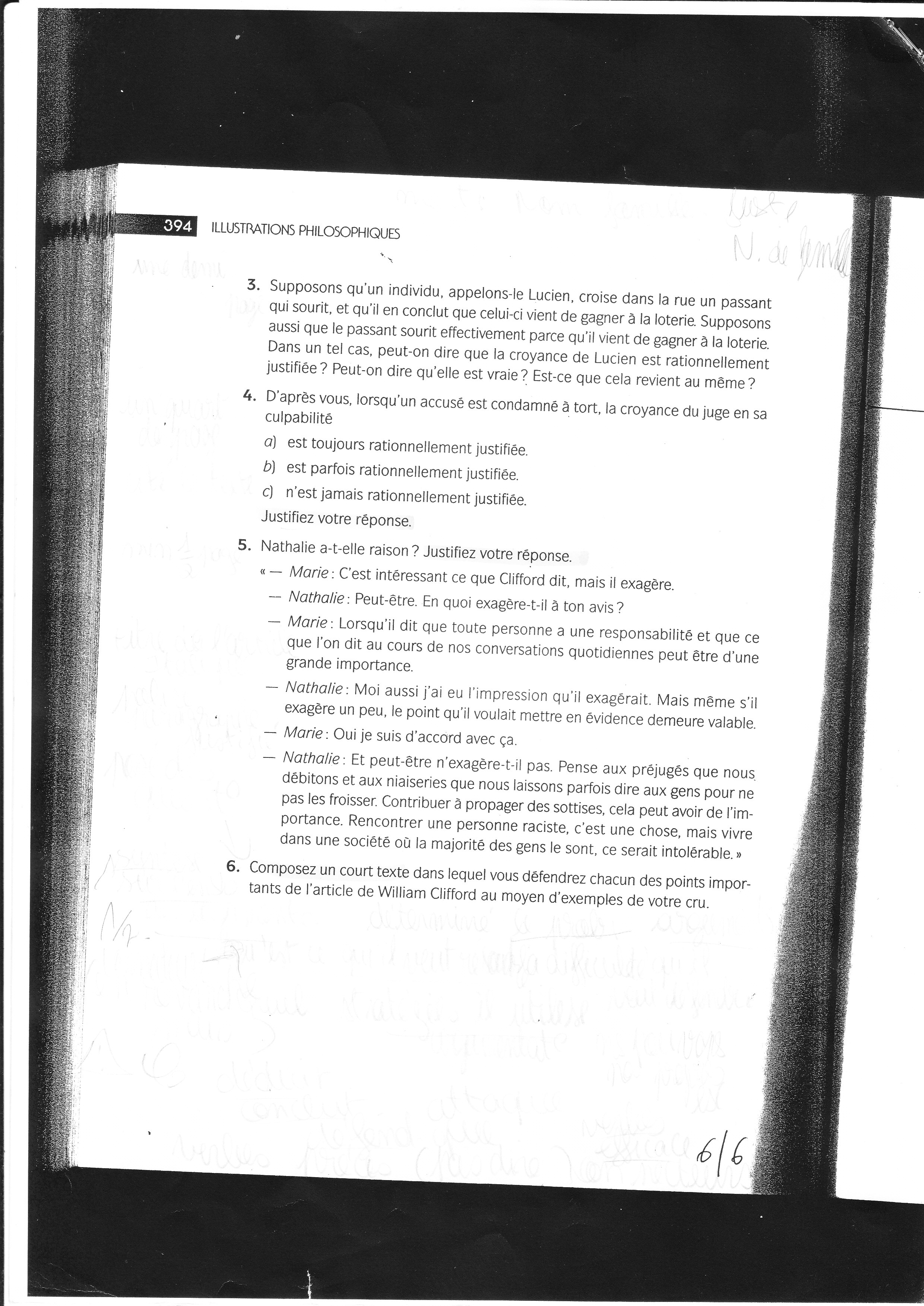 elo974 Posté(e) le 20 octobre 2010 Auteur Signaler Posté(e) le 20 octobre 2010 salut a tous! j'aurais besoin d'aide pour un devoir de philosphie c'est mon tout premier sur l'éthique des croyances en fet j'ai relu plusieurs mais je ne comprend pas les questions mais le texte je comprends svp pourriez vous m'aidez j'ai des idées mais je ne peux pas m'exprimer correctement dans un langage philosophique et sans fautes xd! j'aurais vraiment besoin d'un coup de main c'est très important c'est mon premier devoir de philo et j'aimerais pas me planter! vous me comprenai je ne comprend pas les questions qu'est ce que sa veut dire rationnellement? j'ai joint le texte et les questions... je sais le texte et long a lire mais vous pourriez faire cet effort de jetter un coup d'oeil pour une lycéenne en détrèse xd! et les questions aussi j'ai joint merci d'avance c'est très gentil merci de votre compréhension ! j'attends des réponses avec impatience! c assez urgent merci encore! vous pourriez répondre aux 6 questions svp je vous serrez trés reconnaisante merci! j'analyserais vos réponse et j'essayerais de comprendre! vous pouvez laissé votre adresse msn pour:blush: que vous m'expliquer si je n'ai pas compri ou votre facebook merci d'avance bonne soirée a tous et merci a vous tous! svp aidez moi je vous en supplie c vrai que les piéces jointes ne sont pas dans l'ordre mais c facile a idstinguer lesquel faut lire d'abord svp svp svp vraiment besoin d'aide tte les aides sont la bienvenue merci d'avance