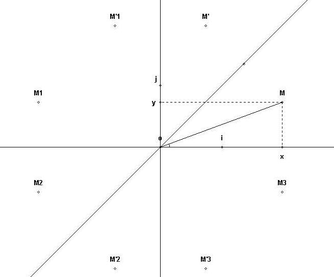 philippe Posté(e) le 27 novembre 2003 Signaler Posté(e) le 27 novembre 2003 bonjour, 1. tan (y/x) ?? ou tan(teta)=y/x...? 2. regarde le dessin. identifie les coordonnées des points M1...M3 et M'1...M'3 avec celles que tu as x-iy; -x+iy; -x-iy; y+ix; -y+ix; y-ix; -y-ix détermine facilement un argument de chacun de ces points. (quant au module, ce n'est pas bien compliqué)