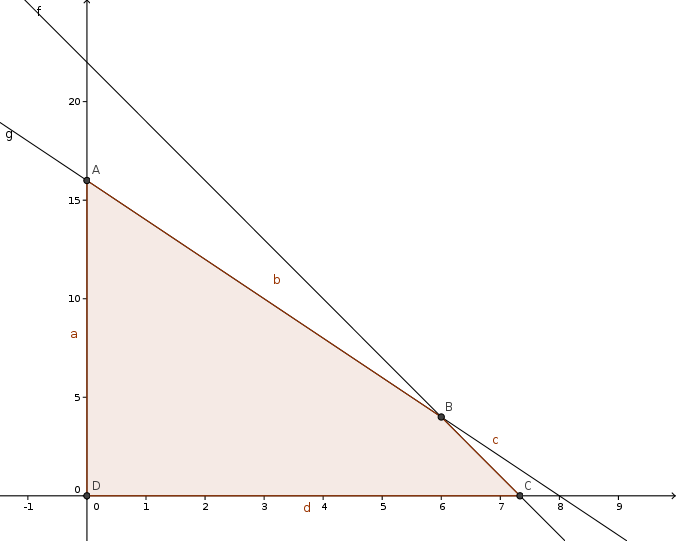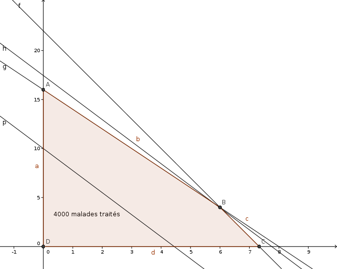 E-Bahut Boltzmann_Solver Posté(e) le 7 novembre 2010 E-Bahut Signaler Posté(e) le 7 novembre 2010 Exo 2 : 1) x => 0 car les unités sont forcement positives y => 0 idem Il ne faut pas prendre plus de 22 passagers. Donc 3x+y <=22 => y 22-3x Il ne faut pas prendre plus de 8 tonnes de matériel. Donc, 1000x+500y 8000 => y 16-2x 2) On obtient le graphique : J'ai pas hachuré la zone qui n'est pas solution mais mis en rouge pale, la zone solution (car je ne sais pas faire simplement sur geogebra cette opération). JE te laisse le refaire en suivant l'énoncé. 3)a) N = 900x + 400y => y = N/400 - 9x/4 b) 4) En déplaçant (D), on fait varier N. Donc, on cherche la position de D la plus haute (donc, de N maximum) passant par au moins un point du polygone des contraintes. b) On lit sur le graphique de 3)b) que N est maximale quand la courbe passe par le point B de mon dessin de coordonnée (6,4). 5) Donc avec un transport, on peut prendre 6 unités A et 4 unités B qui permette de traiter 900*6+400*4 = 7000 malades.