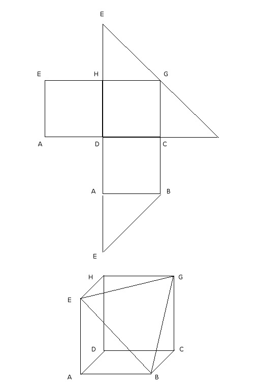 E-Bahut Barbidoux Posté(e) le 1 décembre 2010 E-Bahut Signaler Posté(e) le 1 décembre 2010 Exo 31 -------------- Volume du solide = volume -volume de la pyramide FEGB de base FBG et de hauteur FE=5*5*5-(5*5*5/2)/3=125*(1-1/6=625/6=104,167 cm^3 -------------- Exo 46 --------------- Les triangles rectangles SAB, BAC et CAS sont isométriques ==> SC=SB=BC Thèorème de Pythagore dans le traiangle SAC ==> SC=√(AS^2+AC^2)=√50 Conclusion : SBC est un triangle équilatéral ---------------- Le Plan ABC est perpendiculaire à SA donc SA est perpendiculaire à touts les droites du plan ABC Le Plan EFG est // au plan AB donc perpendiculaire à SA donc SA est perpendiculaire à toutes les droites du plan EFG EG et AC sont perpendiculaires à SA donc // entre elles EF et ABC sont perpendiculaires à SA donc // entre elles FG et BC sont perpendiculaires à SA donc // entre elles