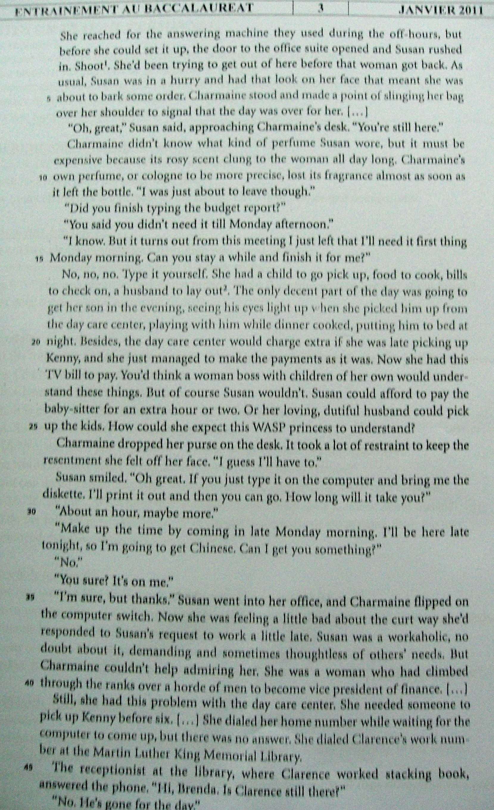 rickles Posté(e) le 22 décembre 2010 Signaler Posté(e) le 22 décembre 2010 Bonjour puis-je avoir de l'aide pour ce qui se trouve en pièce jointe merci les questions sont 1)Pick out two elements showing Charmaine was about to leave 2)Pick out two elements showing Susan is a busy women 3)line 4/5 "she was about to bark some order" What does this sentence reveal about Susan? 4)What does Susan want Charmaine to do? 5)Where and when does the scene take place? 6)How many characters are present in the scene?(names and occupations) 7)Pick out one detail concerning each woman's husband showing they are different. 8)Line 34 "It's on me" What does this sentence mean 9)Who do following adjectives apply to. jutify your answers by quoting from the text. annoyed,hard_working,ambitious,worried 10)Do the 2 women like their jobs 11)The 2 women don't come from the same social background. 12)Charmaine has mixed feelings towards Susan. (pick out one sentence + and one sentence -)