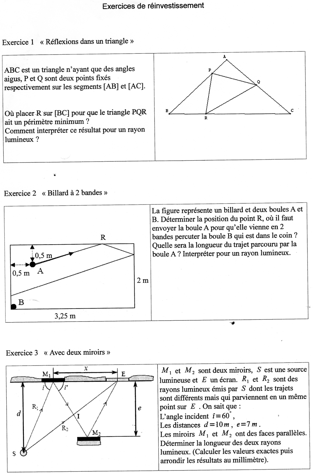 E-Bahut Barbidoux Posté(e) le 9 janvier 2011 E-Bahut Signaler Posté(e) le 9 janvier 2011 1------------------------- J'aurais dit : Min du périmètre de PRQ est aussi le minimum de PR+RQ et de PR^2+QR^2 P' la projection orthogonale de P sur BC Q' la projection orthogonale de Q' sur BC PP'=a par construction QQ'=b par construction P'Q'=c par construction On pose P'R=x f(x)=PR^2+QR^2=a^2+x^2 +(c-x)^2+b^2 =2*x^2-2*c*c+a^+b^2+c^2 et f(x) est mimimal lorsque f'(x)= 4*x-2*c=0 ==> x=c/2 2------------------------- a, b c et d sont des grandeurs connues : a=0.5, b=3,25, c=2 et d=2,75 Exprimer la coth de l'angle alpha de trois manières diffréntes ce qui conduit à un système de deux équations à deux inconnues : a/x = (c - y)/(d - x) (c - y)/(d - x) = y/b Dont on déduit a/x=y/b ==> x*y=a*b puis a*d-a*x=c*x-x*y ==> a*d-a*x=c*x-a*b ==> x=(a b + a d)/(c + a)=1,2 et y=0,5*3,25/1,2=1,35417