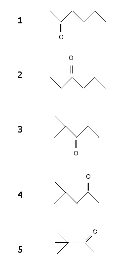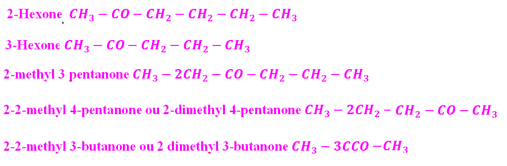 E-Bahut Barbidoux Posté(e) le 3 février 2011 E-Bahut Signaler Posté(e) le 3 février 2011 1) Donner le groupe caractéritique des cétones. -CO- 2) Ecrire la formule brute générale d'une cétone saturée ( ne comportant pas de double liaison carbone-carbone) comportant n atomes de carbone (on exprimera les indices des autres atomes en fonction de n). CnH2nO 3) Sachant que la masse molaire d'une cétone est M:86g.mol^-1, en déduire la valeur de n, le nombre d'atomes de carbones de la molécule. Mcetone=12*n+2*n+16 ==>86 ==>14*n=84 ==> n=6 et la cétone cherchée est C6H12O 4) Rechercher les formules semi-développées et les noms correspondants de toutes les cétones isomères non cycliques. 1- CH3COCH2CH2CH2CH3 2-hexone 2- CH3CH2COCH2CH2CH3 3-hexone 3- (CH3)2CH2COCH2CH3 2-methyl 3-pentanone 4- (CH3)2CH2COCH2CH3 2-methyl 4-pentanone 5- (CH3)2CH2CH2COCH3 2-2-methyl 4-pentanone ou 2-dimethyl 4-pentanone 6- (CH3)3CCOCH3 2-2-methyl 3-butanone ou 2-dimethyl 3-butanone