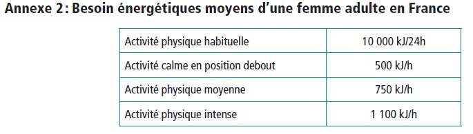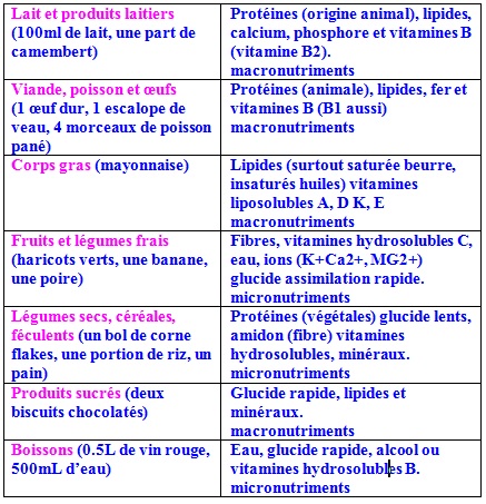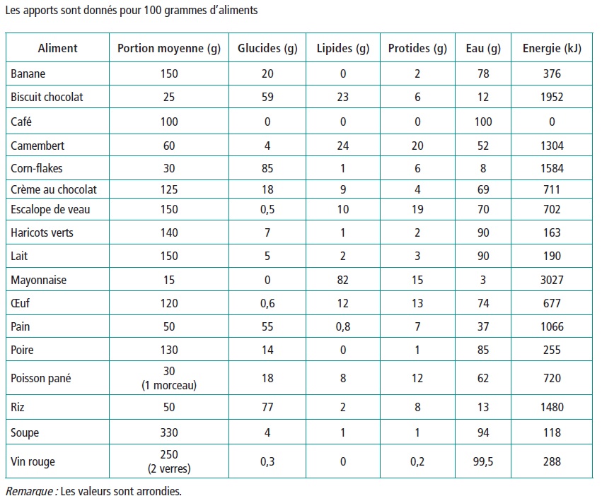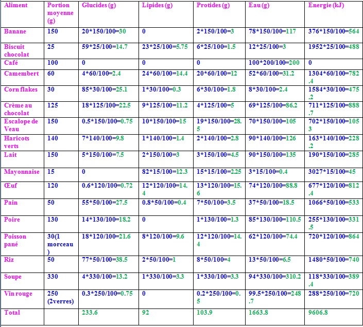 Su Princess Posté(e) le 3 février 2011 Signaler Posté(e) le 3 février 2011 Bonsoir J'ai fait un devoir mais il y a quelques questions (surtout de calcul) où je voudrais qu'on m'aide, s'il vous plait. Voici l'énoncé et les questions avec mes réponses en italique ( il y a deux annexes jointes): Partie 1 : Les aliments Madame R est une femme joviale, âgée de 45 ans, célibataire, et mesurant 1,71 m pour une masse corporelle de 97 kg. Elle travaille à 7 km de chez elle comme clerc de notaire, et utilise sa voiture pour se rendre à son travail. Les menus de madame R pour aujourd’hui sont les suivants : Petit déjeuner : 2 tasses de café non sucré (200 ml), un bol de corn-flakes avec 100 ml de lait et un comprimé effervescent lui apportant des vitamines et certains oligo-éléments. Déjeuner : 1 oeuf dur avec de la mayonnaise, 1 escalope de veau avec des haricots verts, une part de camembert avec un morceau de pain et une poire. La boisson est constituée par 0,5 litre de vin rouge. Diner : 1 bol de soupe, 4 morceaux de poisson pané, une portion de riz et une crème au chocolat. La boisson est constituée par de l’eau (500 ml). Collations : à 16h, madame R a mangé deux biscuits chocolatés et avant d’aller dormir, elle a pris une banane. 1.1. Présenter la classification et les grands groupes d’aliments utilisés en diététique. (j'ai joint mon tableau) Cette classification indique également les apports principaux de chaque groupe d’aliments. 1.2. Préciser les éléments apportés par chaque groupe. 1.3. Classer les différents aliments absorbés par madame R dans les catégories correspondantes de la classification présentée. (pour ces deux questions, ils font partie du tableau) Le comprimé effervescent pris le matin n’a pas sa place dans la classification diététique. 1.4. Après avoir défini les additifs et les compléments alimentaires, indiquer en le justifiant à laquelle de ces deux catégories appartient le comprimé effervescent. Additifs alimentaires : substances ajoutées aux aliments au cours de leur fabrication pour faciliter la fabrication ou pour améliorer la conservation, la saveur ou l’aspect des aliments. Additifs d’origine naturelle ou synthétique. Compléments alimentaires : substance ajoutées aux repas ou consommée hors des repas et qui ont pour but de compenser un manque dans la ration alimentaire. Le comprimé effervescent est un complément alimentaire car il apporte des vitamines et certains oligo-éléments. De plus, il est consommé au repas de Madame R. Partie 2 : Les apports nutritionnels 2.1. A l’aide de l’annexe 1 fournie (extrait d’une table de composition alimentaire), calculer les apports de la journée en glucides, lipides, protides, eau et énergie pour madame R. (j'ai joint mon tableau ; un autre) 2.2. Préciser (en le justifiant) si les rapports entre glucides, lipides et protides sont corrects pour cette ration alimentaire. Là je ne sais pas comment m'y prendre. Les glucides apportent 17kJ par gramme, les lipides 39kJ et les protides 18kJ. Comment faire pour calculer leurs apports pour cette ration alimentaire? 2.3. Indiquer les apports énergétiques nécessaires pour madame R et préciser si les apports énergétiques de la ration alimentaire sont satisfaisants. Les apports énergétiques que doit apporter Madame R sont de 8400kJ mais sa ration alimentaire lui en apporte 9606.8kJ ce qui est beaucoup. 2.4. Indiquer si les apports hydriques de madame R sont satisfaisants au cours de cette journée. Je n'ai pas compris de quel apport s'agit-il ? 2.5. La prise d’une tasse de thé (200 ml) à 16 heures avec les biscuits chocolatés va-t-elle modifier l’équilibre de la ration alimentaire ? Non, car une tasse de thé (200mL) n’apporte aucune énergie. Partie 3 : Un nouveau mode de vie 3.1. Calculer l’indice de masse corporelle de madame R et en déduire sa corpulence. m/T² soit 97/1.17²=33.1 L’IMC de Madame R est compris entre 30 et 40 ce qui confirme une obésité 3.2. Préciser les risques encourus par madame R du fait de sa corpulence. Madame R présente une obésité qui correspond à un excès de tissus adipeux dans l’organisme et qui le modifie. Ceci peut induire à des pathologies. On observe ainsi de l’arthrose au niveau des genoux ou des hanches. 3.3. Indiquer quelques conseils simples que l’on peut donner à madame R pour réduire sa corpulence. Madame R peut réduire sa corpulence en prenant des médicaments qui diminue les apports énergétiques. Madame R décide de laisser sa voiture et de prendre son vélo pour aller travailler. Elle réalise ainsi 1 heure d’activité physique moyenne par jour. 3.5. Calculer à l’aide de l’annexe 2 la nouvelle dépense énergétique journalière de madame R. L’apport journalier de Madame R était de 9606.8kJ, avec 1 heure d’activité physique moyenne par jour, sa nouvelle dépense énergétique journalière sera : 9606.8-750=8856.8kJ. 3.6. Indiquer les conséquences à long terme de ce nouveau mode de vie (en considérant que la journée étudiée est une journée représentative pour madame R) Si Madame R continue son activité physique moyenne, elle aura un IMC normale. Merci d'avance.