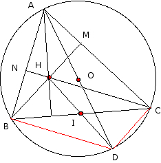 jasmiinee Posté(e) le 7 février 2011 Signaler Posté(e) le 7 février 2011 bonjour, je ne comprends rien à mon exercice de maths : j'ai essayer plusieurs fois de construire la figure mais je n'y arrive pas! meme les questions exercice1 : 1) construire un triangle ABC et © son cercle circonscrit. On note O son centre. Les points M et N sont les pieds des hauteurs issues respectivement de B et de C. Les deux hauteurs (BM) et (CN) sont sécantes en H. Le point I est le milieu du segment [bC]. Construire le point D symétrique du point A par rapport au point O. 2) a) Démontrer que les droites (AC) et (DC) sont perpendiculaires. b) En déduire que les droites (CD) et (BM) sont parallèles. 3) a) Démontrer que le quadrilatère BHCD est un parallèlogramme. b) En déduire que le point I est le milieu du segment [HD] 4) a) démontrer que les droites (AH) et (OI) sont parallèles. b) Démontrer que la droite (AH) est la troisième hauteur du triangle ABC. Aidez moi svp