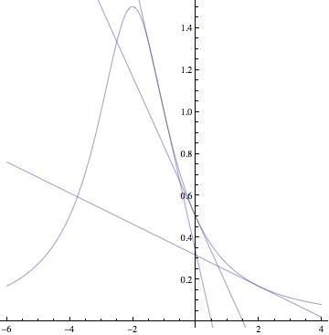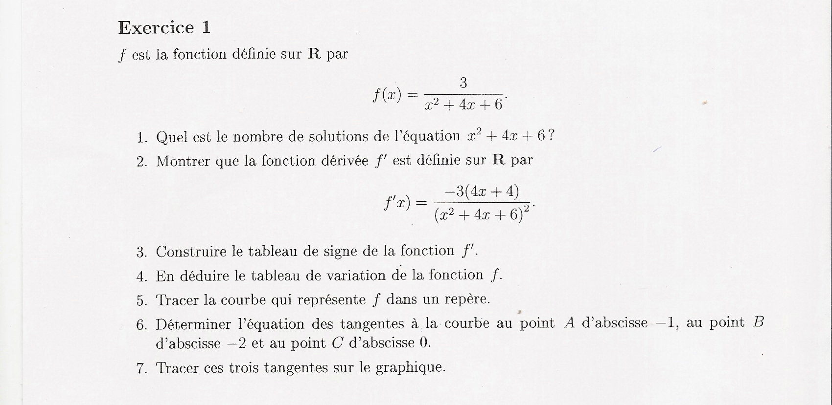 E-Bahut Barbidoux Posté(e) le 20 février 2011 E-Bahut Signaler Posté(e) le 20 février 2011 1) x²+4x+6=0 > delta= -8 donc, delta<0, il n'y a pas de solutions réelles. 2)(k/u)'=-k*u'/u^2 ==> u'=2*x+4 ==> f'(x)=-3*(2*x+4)/(x^2+4*x+6) il y a une faute de frappe dans le sujet 3) résultat du tableau de signe : x.......(-∞)......................(-2).............................(∞) f'(x)..........(+)................(0)..........(-)....................... f(x)...0....crois............max.....decrois...............0 Limites x-->-∞ ==> f(x)≈ 1/x^2 ->0 x-> ∞ ==> f(x)≈ 1/x^2 ->0 Maximum en x=-2 ==> f(-2)=3/2 4) elle est croissante jusqu'à -2 puis décroissante . 5) graphique 6) - la tangente à la courbe du point M d'abscisse a à pour équation: y= f'(a) (x-a) + f(a) f'(-1)=-2/3 f(-1)=1 => y=-2*x/3+1/3 ---------------------------- f'(2)=-2/27 f(2)=1/6 => y=-2*x/27+17/54 -------------------------------- f'(0)=-1/3 f(0)=1/2 => y=-x/3+1/2 7) graphique