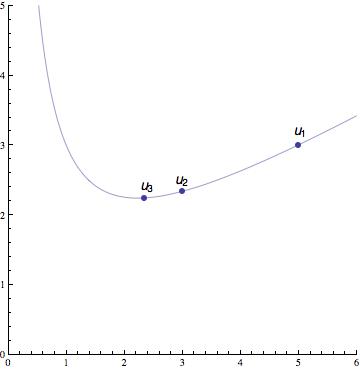 E-Bahut Barbidoux Posté(e) le 22 février 2011 E-Bahut Signaler Posté(e) le 22 février 2011 1----------------- f'(x)=(1/2)*(1-5/x^2) =(x^2-5)/(2*x^2 ) 2---------------- f'(x) s'annule pour x=√5 et x=-√5 et est du signe du coefficient de x^2 à l'extérieur de ses racines 3----------------- x......0........................√5............................... f'(x)............(-).............(0).............(+)............. f(x)..∞......decrois....Min..........crois........,∞ 4------------------- 5------------------- g(x)=f(x)-x=(1/2)*(-x/2+5/x) g'(x)=(1/2)*(-1-5/x^2) = -(x^2+5)/(2*x^2 ) <0 qq soit x ==> g(x) est décroissante g(x)=f(x)-x=(1/2)*(5-x^2)/x) s'annule pour x=√5 x.............0..............................√5................................ g(x)........∞.........(+)...............(0)............(-)................. Deuxième partie 1------------------- u1=f(5)=3 u2=f(3)=7/3 u3=f(7/3)=41/21 2------------------ les point {un, f(un)} qui appartiennent au graphe de f(x) ce qui montre que la limite inférieure de f(un) est égale au minimun de f(x) soit √5 ce qui de dire que f(un) est minorée par √5 3------------------- un+1-un=g(un) <0 pour un>√5 (voir question 5 de la première partie) ce qui permet de dire que un est une série décroissante 4------------------- Si un est une série croissante alors un+1 < un ==> 1/un <1/un+1 ==> vn<vn+1 ce qui montre que vn est une suite croissante. 5------------------- La suite un étant minorée par √5 il s'en suit que vn =5/un est majorée par √5 . Les suites vn et un sont adjacentes et l'intervalle [vn, un] constitue un encadrement de √5 dont la précision augmente avec la valeur de n.