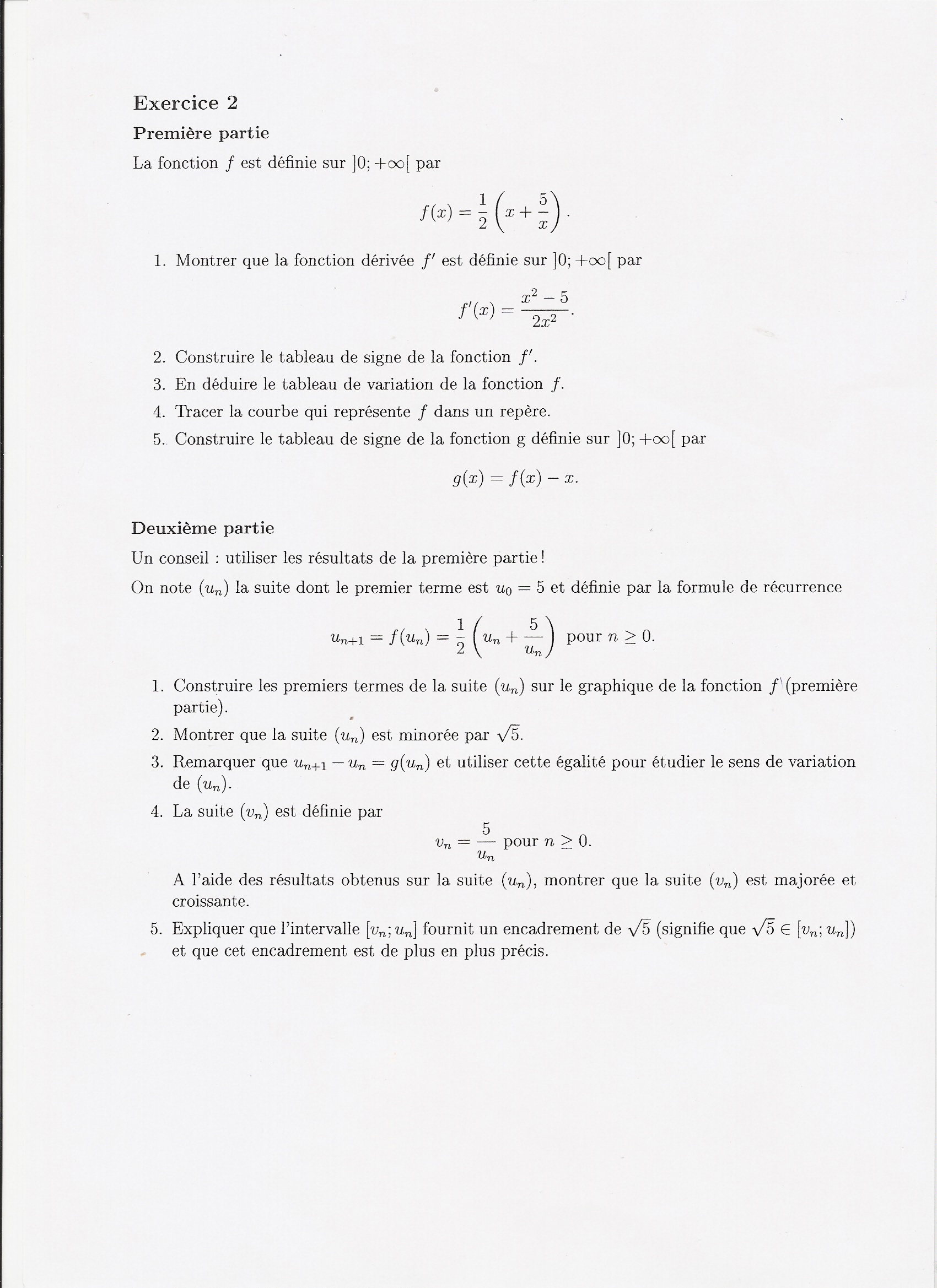 mbody94 Posté(e) le 22 février 2011 Signaler Posté(e) le 22 février 2011 bonjour, pouvez m'aider sur ces deux exercice SVP!!! voir le sujet sur la pièce jointe. voici mes réponse: première partie: 1) je n'arrive pas à faire cette question ! 2) et 3) x-------------(-infinie)------------(-rac(5))--------(rac(5))-------------(+infinie x²-5 + - + 2x² + + + signe de f'(x) + - + variation f(x) croissant décroissant croissant 4) graphique 5) j'ai essayer de faire f(x)- x comme demander, mais je n'y arrive pas. deuxiéme partie: 1) construction graphique avec la droite y=x 2) on a donc : Un > rac(5) soit : Un - rac(5) > 0 => 0.5Un+ 2.5/Un - rac(5) 3) ; 4) ; 5) : je suis bloquer la dessus !!! merci d'avance!!!