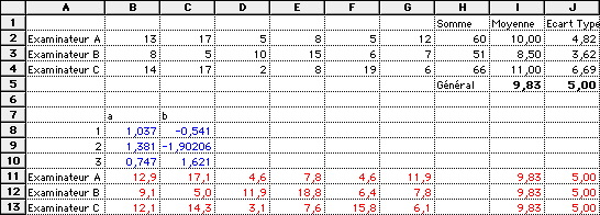 E-Bahut Barbidoux Posté(e) le 13 avril 2011 E-Bahut Signaler Posté(e) le 13 avril 2011 Il te faut calculer la variance et la moyenne de chaque examinateur ainsi que la moyenne et la variance globale ce qui donne la première partie du tableau joint. Par soucis d'homogénéisation des notes on veut que la moyenne de chaque examinateur et son écart type soient identiques à l'écart type et la moyenne générale. Pour cela on aplique une relation affine de type a*x+b aux notes de chaque examinateur. Sachant que : variance (a*x+b)=a^2 variance (x) ==> s=√variance(a*x+b)=a*√variance (x) ==> a=s/√variance (x) mXi=(1/n)somme i=1 à n de (a*nXi+b)=m ==>b=m-mA on en déduit pour l'examinateur A par exemple a=variange gérérale/variance de l'examinateur=5/4,82=1,037 b=moyenne générale-a*moyenne examinateur =9,83-1,037*10=-0,54 Ensuite les notes de l'examinateur A sont re-caculée en utilisant la relation y=a*x+b ou la valeur de x correspond à l'ancienne note et y à la nouvelle note (après homogénéisation). On procède de même pour les examinateurs B et C. On vérifie alors que la moyenne (et son écart type) des notes de chaque examinateur est bien égale à la moyenne générale (et son écart type).