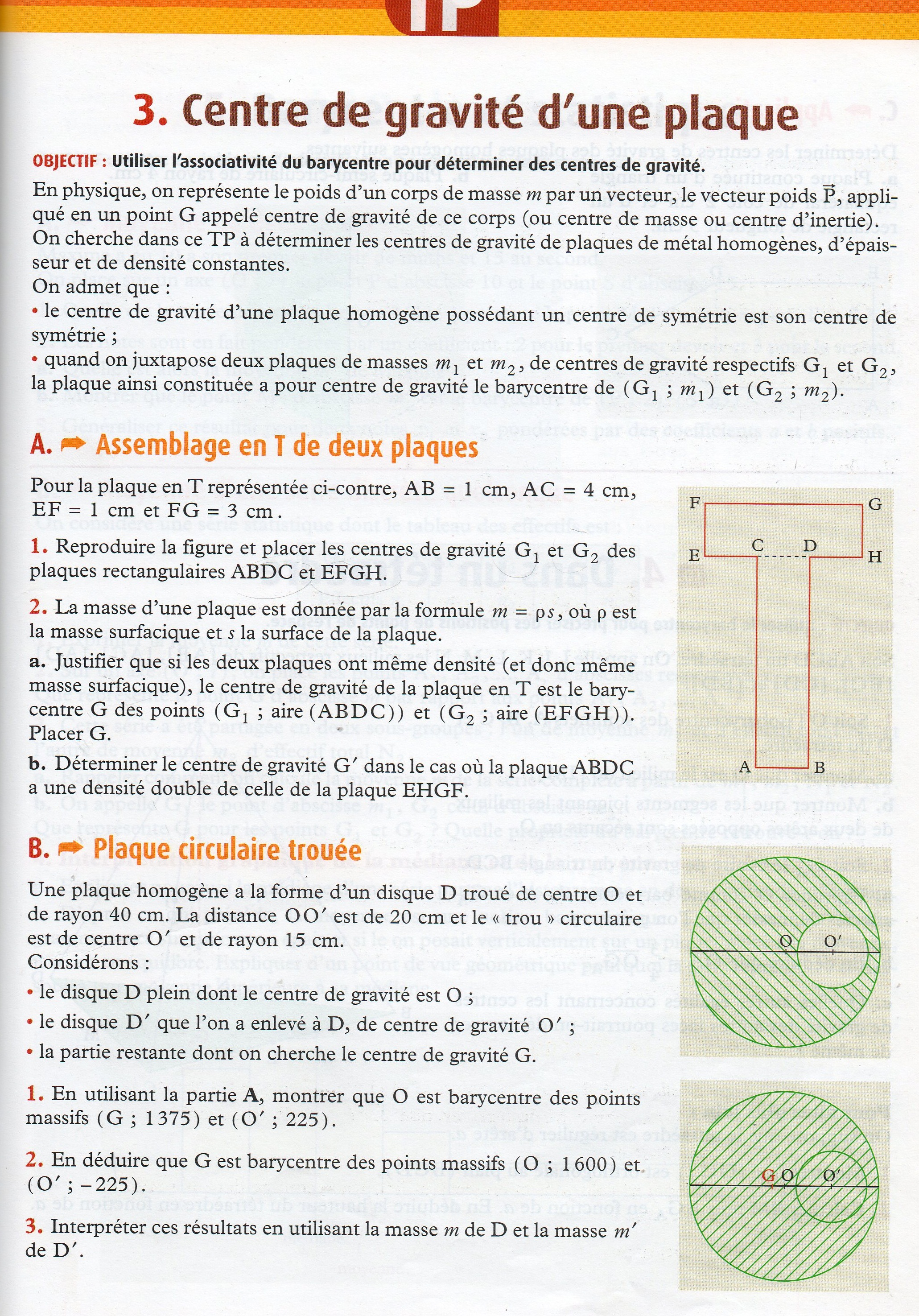 Rom_Star_En_Maths_TV Posté(e) le 19 avril 2011 Signaler Posté(e) le 19 avril 2011 Hello Jess, Pour A ) 1 ) , tu as réussi à placer les barycentres G1 et G2 ? Ils sont juste au milieu des rectangles... 2 ) a) Pour démontrer cela, écris la relation vectorielle qui caractérise G comme étant le bary de G1 et de G2 avec les poids cités. Cette relation vectorielle peut être celle encadrée en rouge dans la vidéo où j'explique le barycentre de 3 points : http://www.star-en-maths.tv/barycentre-1ere-s/ Tu divises ensuite cette égalité par la densité "ro" à gauche et à droite, et tu obtiendras une relation qui caractérise G comme étant le barycentre de G1 et de G2 avec comme poids les aires des rectangles. Pour placer G, calcule ces aires, obtiens ces fameux poids et utilise la relation vectorielle où tu remplaces M par G... b ) Il faut reprendre avec une densité double, cela veut juste dire que sont poids est double, il va attirer le point G' vers lui . Redis-nous déjà où tu en es après cela ! Romain
