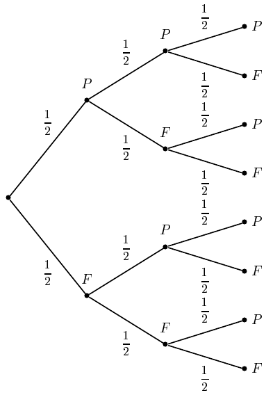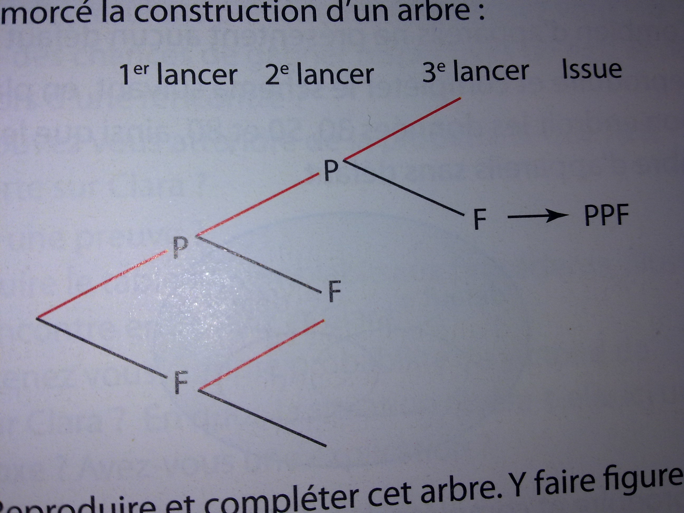 celinex57 Posté(e) le 26 avril 2011 Auteur Signaler Posté(e) le 26 avril 2011 On lance trois fois une pièce de 1€ supposée bien équilibrée. Pour illustrer les différents scénarios possibles, on a amorcé la construction d'un arbre : 1)a) Reproduire et compléter cet arbre. Y faire figurer les probabilités des différentes branches. b) Chaque chemin représente une issue de cette expérience. Préciser le nombre d'issues et donner la probabilité de chacune. 2) Déterminer les probabilités des événements ci-dessous, en rappelant les règles de calcul utilisées: E0 « obtenir aucun pile » ; E1 « obtenir un pile » ; E2 « obtenir deux pile » ; E3 « obtenir trois pile ». 3) Si on prend ={E0,E1,E2,E3} comme ensemble des issues de cette expérience, donner dans un tableau la distribution de probabilité associée. Quelle vérification peut-on faire ? La somme des probabilités de E_0, E_1, E_2 et E_3, représentant la totalité de l'univers de l'expérience, est égale à 1. J'ai fait mon arbre j'ai trouvé comme issue ppp probabilité: 3/3 Tu as un intérêt à revoir ton cours vite fait, la probabilité PPP s'obtient en multipliant 1/2 *1/2*1/2 ce qui donne 1/2^3=1/8.... pas 3/3 qui n'a aucun sens. ppf 2/3 pfp 2/3 pff 1/3 fpp 2/3 fpf 1/3 ffp 1/3 fff 0/3 J'ai obtenu 8 issues (8 issues est correct) Dans l'exercice je ne comprend pas : Dans la question 2) j'arrive a donner la probabilité mais je sais pas c'est quoi les calcules. Et je comprend pas du tout la question 3)
