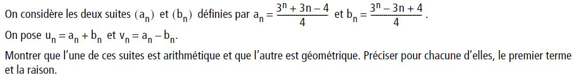 E-Bahut Papy BERNIE Posté(e) le 11 mai 2011 E-Bahut Signaler Posté(e) le 11 mai 2011 Bonjour, Je m'aperçois que j'ai fait une erreur sur Un. Tu additionnes an+bn et ça te donne le Un =3n/4 + 3n/4=3n(1/4+1/4)=(1/2)3n Donc : Un+1=(1/2)3n+1=(1/2)3n*3 Un+1/Un=(1/2)3n*3 /(1/2)3n=3 C'est la définition d'une suite géométrique de raison 3. Le 1er terme est U1=(1/2)*31=3/2