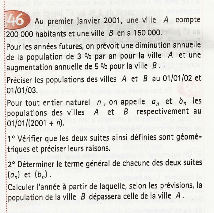 Rom_Star_En_Maths_TV Posté(e) le 16 mai 2011 Signaler Posté(e) le 16 mai 2011 Salut mbody, Pour le 1er : Pour obtenir les différents termes sur un graphique, tu traces la droite d'équation y = x et la 2ème droite, notons-la DELTA, d'équation y = (1/3)*x - 2 Tu mets U0 sur l'axe des abscisses, tu prends son image par DELTA,tu vas obtenir U1 sur l'axe des ordonnées (pour un rappel sur image et antécédent d'un nombre, tu peux regarder ma vidéo : http://www.star-en-maths.tv/2nde-comprendre-image-et-antecedent/ ) Puis tu "ramènes" U1 sur l'axe des abscisse grâce à la droite y=x, comme ça, tu peux le comparer à U0... Et ainsi de suite, tu obtiens U2, U3 ...Etc Tu vas pouvoir conjecturer qu'elle est croissante ou décroissante ou ni l'un ni l'autre.. Pour la question 5 de l'exo 1 : Calcule V(n+1) en remplaçant n par n+1 dans lé définition de la suite (Vn), puis exprime V(n+1) en fonction de Vn... Tu vas voir qu'elle est géométrique (pour un rappel sur les suites arithmétiques et géométriques, regarde ces 4 vidéos : http://www.star-en-maths.tv/videos-laura/ ) Pour l'exo 46, 2ème image, regarde vraiment les 4 vidéos précédentes, c'est la même chose au niveau de la suite géométrique !! Bon courage !! Romain
