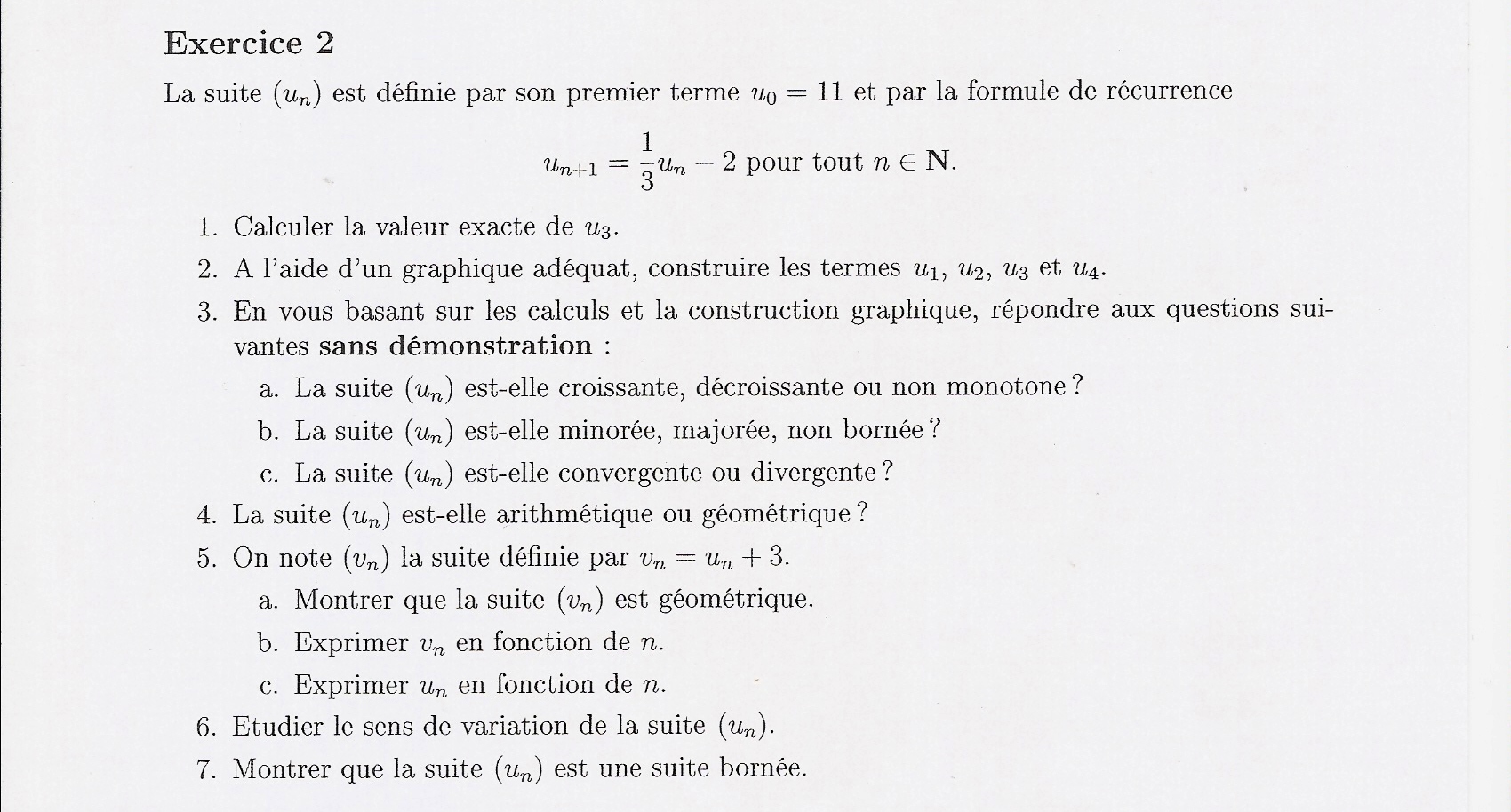mbody94 Posté(e) le 16 mai 2011 Signaler Posté(e) le 16 mai 2011 bonjour, voila je bloque totalement sur deux exercice de suite. le premier exercice j'arrive a faire les première question et pour l'exercice 2 aucune . voir les sujet sur la pièce jointe . exercice 1 : 1) u3 = -67/ 27 ( je crois qu'elle est décroissante même si ce n'est pas le cas sur le graphique) 2) pour le graphique pas de problème . faut-il tracer la droite y=x ? 3) a. la suite est décroissante. à vérifier ! b. à partir de la je n'arrive pas exercice 3 : complétement bloqué .