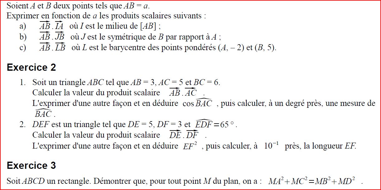 E-Bahut Barbidoux Posté(e) le 21 mai 2011 E-Bahut Signaler Posté(e) le 21 mai 2011 Exo 1 -------------------- (AB,IA)=Pi |IA|=a/2 AB.IA= -a*a/2=-a^2/2 -------------------- (JB,AB)=0 |JB|=2*a JB.AB=a*2*a=2*a^2 -------------------- L est barycentre de (A,-2) et B(,5) ==> -2*LA+5*LB=0 ==> -2*LB-2*BA+5*LB=0 ==> 3*LB=2*BA ==> LB=2*BA/3 ==> AB*LB=AB*2*BA/3= -(2/3)*a^2