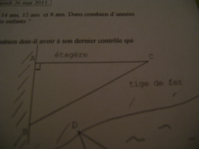 mzelle Posté(e) le 24 mai 2011 Signaler Posté(e) le 24 mai 2011 Bonjour,c'est la première fois que je comprends rien sur un dm de maths je suis perdu pouvez-vous m'aidez s'il vous plait: Exercice 1: une femme de 42 ans a 3 enfants respectivement âgés de 14 ans,12 ans et 8 ans.Dans combien d'années l'âge de la mère sera égal a la somme des âges de ses trois enfants ? Exercice 2: Kévin a eu 9 et 13 à ses deux contrôles de mathématiques.Combien doit-il avoir à son der nier contrôle qui compte double s'il veut avoir 12 de moyenne ? Exercice 3: On accroche au mur une étagère de 35cm de large. Pour soutenir,on dispose d'une tige de fer de 60cm Calculer la mesure de ^C,arrondie à un degrès près puis la longueur AB arrondie à 0,1cm près. Exercice 4: Mr Schmidt géomètre doit déterminer la largeur de la rivière. Voici le croquis qui figure sur son carnet. AB=100m,BAD=60°?BAC=22°?ABD=90° a)calculer ACà 0,1m près b)calculer BC à 0,1m près c)calculer AD à 0,1m près d)calculer BD à 0,1m près e)en déduire la largeur de la rivière au mètre près Je vous en prie aidez moi s'il vous plait cela fait une semaine que je suis dessus et que je n'y arrive pas. PS:merci d'avance à ceux qui m'aideront