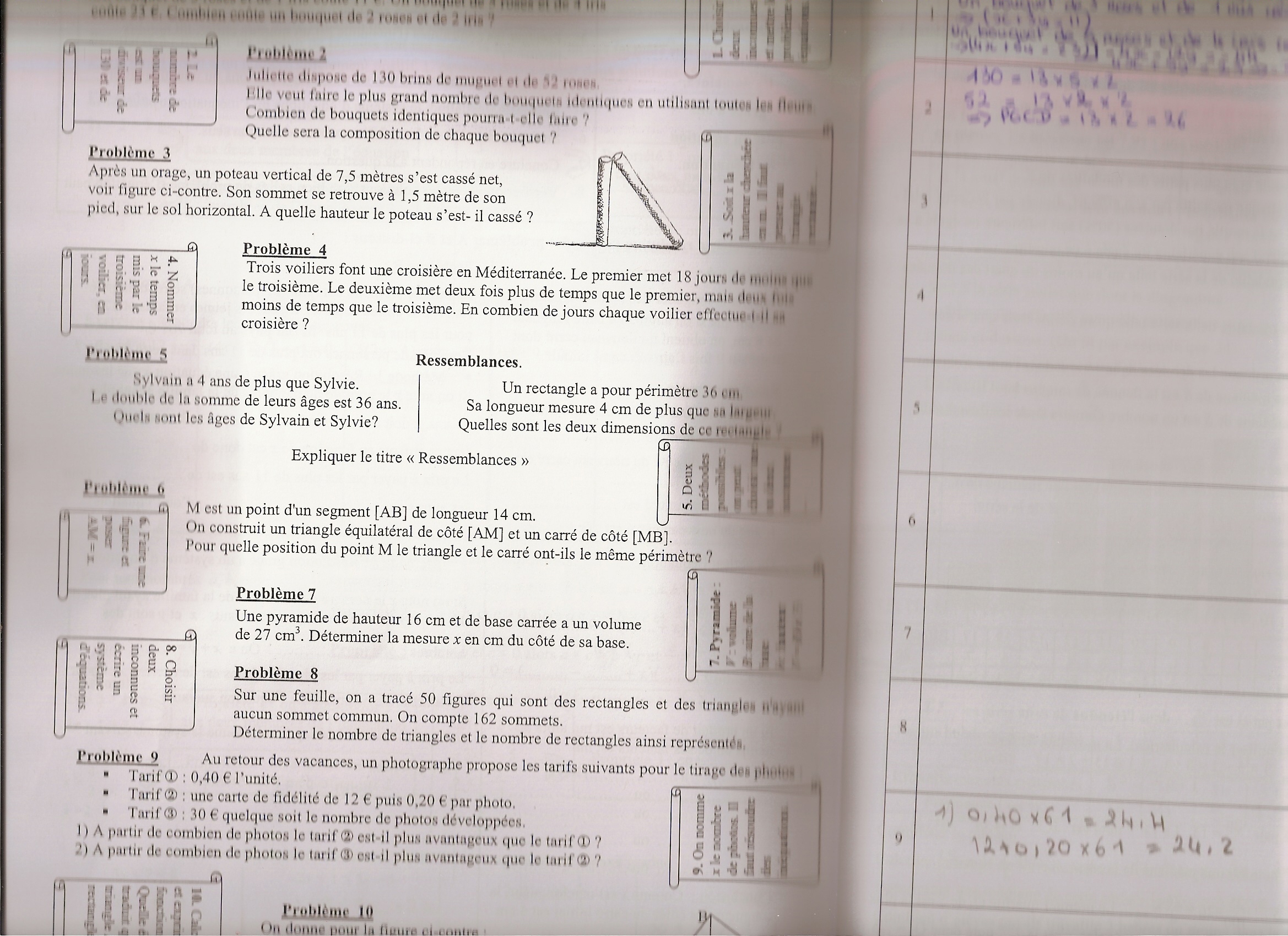 Jeanne1 Posté(e) le 3 septembre 2011 Auteur Signaler Posté(e) le 3 septembre 2011 Il me reste le problème 3,4 et 5 à faire Problème 3 : AB² AC² = BC² 1,5² + AC² = 7,5² AC² = 56,25 - 2,25 AC² = 54 AC = 3 racine de 6 AC = environ 7, 3 Mais ce n'est pas possible, un poteau quand ça se casse net c'est vers le milieu qu'il se casse. Problème 4 : J'ai pris Z pour le premier voilier, Y pour le deuxième voilier et X pour le troisième voilier. Donc j'ai analysé: Y c'est 2z et c'est aussi X/2. Et 2z c'est X/2. Si Z = X-18 2(X-18)=X/2 (2X-36)/1=X/2 Donc on fait le produit en croix: 2*(2X-36)=X*1 4X-72=X 4X-X=72 3X=72 X=72/3 X=24 ensuite ça fait donc, Z=X-18 Z=24-18 Z=6 Et pour trouver Y, j'ai fais Y=2*Z=2*6=12 Donc Y=12. Est-ce que mes 2 problèmes sont bon ?