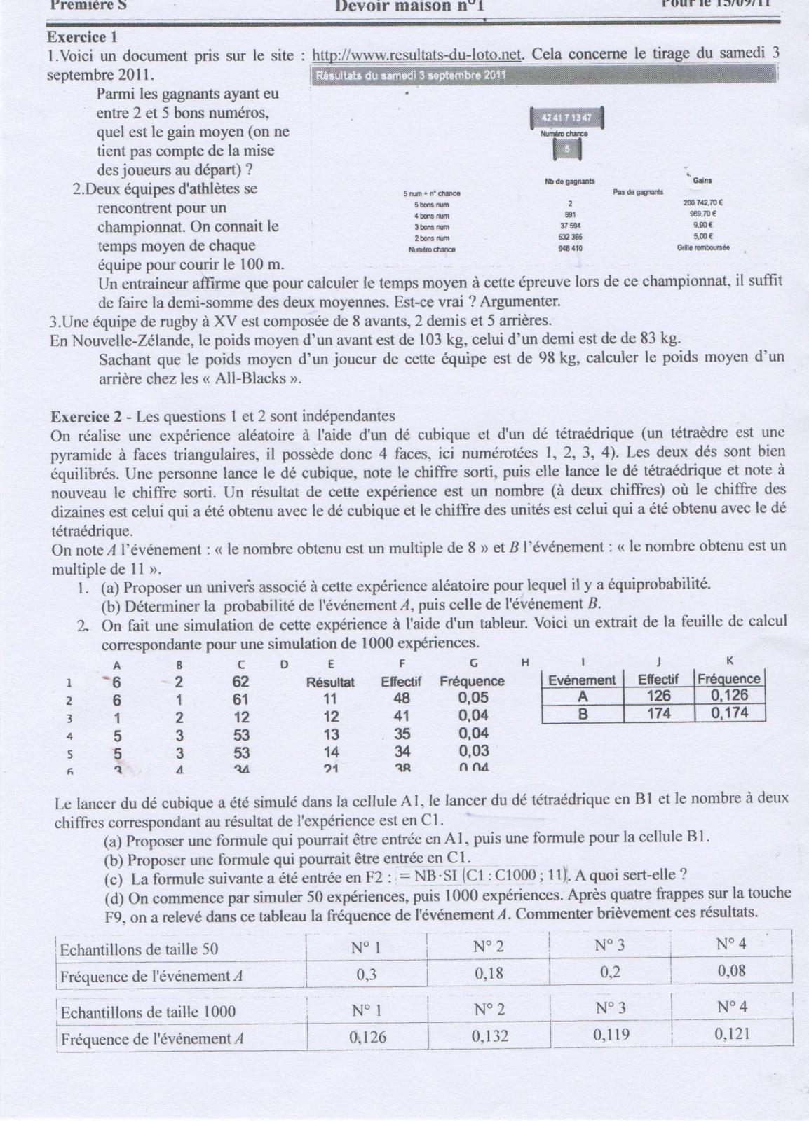 meghane Posté(e) le 10 septembre 2011 Signaler Posté(e) le 10 septembre 2011 Bonjour, J'ai commencé mon dm de maths et il y a juste quelques questions que je n'arrive pas. Pourriez-vous m'aider s'il vous plait. Merci . Voici mes réponses aux autres questions pourriez-vous me dire si j'ai juste : Ex 1 1) J'ai fait 200 742.70*2 + 969.70*891 ... / par le nombres de gagnant donc 4 299 491.70 / 570 852 égal environ 7.53 € 2) Je n'ai pas réussi 3) 103*8 + 53*2 + 5x / 15 = 98 990 + 5x / 15 = 98 990 + 5x = 1470 5x = 480 x = 480/5 x = 96 Ex 2 1) a) Ω = {11 ; 12 ; 13 ; 14 ; 21 ; 22 ; 23 ; 24 ; 31 ; 32 ; 33 ; 34 ; 41 ; 42 ; 43 ; 44 ; 51 ; 52 ; 53 ; 54 ; 61 ; 62 ; 63 ; 64} b) A = nb d'événements réalisant A : 4 nb total d'événement : 24 Donc p(A) = 4/24 B = nb d'événements réalisant B : 3 nb total d'événement : 24 Donc p(B) = 4/24 2) a) A1 =ENT(6*ALEA()+1) B1 = ENT(4*ALEA()+1) b) C1 = ENT(6*ALEA()+1) + ENT(4*ALEA()+1) c) Cela donne le nombre de 11 dans la plage de 1000 cellules allant de C1 à C1000 d) Je n'ai pas trouvé