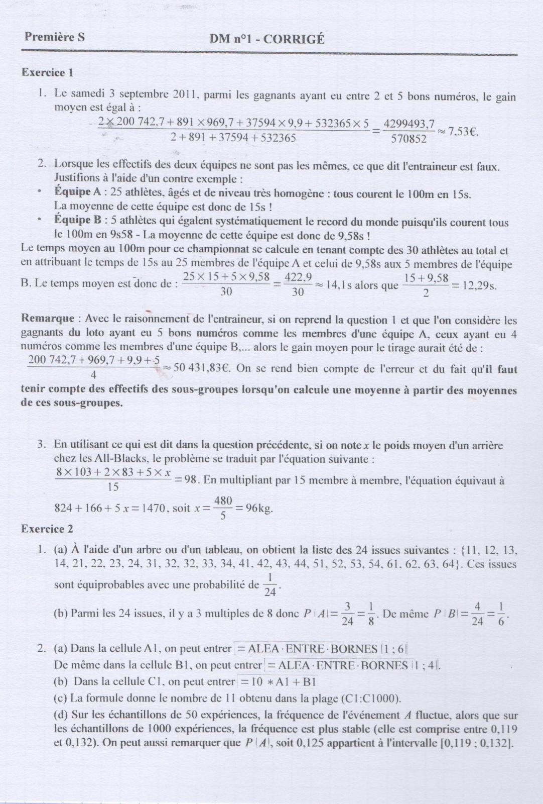 E-Bahut Boltzmann_Solver Posté(e) le 10 septembre 2011 E-Bahut Signaler Posté(e) le 10 septembre 2011 Bonjour, J'ai commencé mon dm de maths et il y a juste quelques questions que je n'arrive pas. Pourriez-vous m'aider s'il vous plait. Merci . Voici mes réponses aux autres questions pourriez-vous me dire si j'ai juste : Pour tous les exos, je ne vérifie que la méthode et non les calculs par manque de temps. Ex 1 1) J'ai fait 200 742.70*2 + 969.70*891 ... / par le nombres de gagnant donc 4 299 491.70 / 570 852 égal environ 7.53 € OK 2) Je n'ai pas réussi Soit, n un entier naturel non nul représentant le nombre d'athlète dans une équipe. Donc, le temps moyen des deux équipes peut s'exprimer comme : T = somme sur i=1 à 2n des ti/(2n) avec ti, le temps au 100m du joueur i. T = 1/2*(somme sur i=1 à n des ti/(n) + somme sur i=n+1 à 2n des ti/(n)) où l'on reconnait le temps moyen pour chaque équipe. Donc, c'est bien la demi somme. 3) LES PARENTHÈSES ET LE RÉDACTION !!! (103*8 + 53*2 + 5x) / 15 = 98 (990 + 5x) / 15 = 98 (990 + 5x) = 1470 5x = 480 x = 480/5 x = 96 Une phrase de conclusion, sinon, l'idée y est. Ex 2 1) a) Ω = {11 ; 12 ; 13 ; 14 ; 21 ; 22 ; 23 ; 24 ; 31 ; 32 ; 33 ; 34 ; 41 ; 42 ; 43 ; 44 ; 51 ; 52 ; 53 ; 54 ; 61 ; 62 ; 63 ; 64} OK b) Card(A)= nb d'événements réalisant A : 4 nb total d'événement : 24 Donc p(A) = 4/24 Faux, détaille le cardinal de A. B = nb d'événements réalisant B : 3 nb total d'événement : 24 Donc p(B) = 4/24 Faux, détaille le cardinal de B (t'as du intervertir les deux). 2) a) A1 =ENT(6*ALEA()+1) B1 = ENT(4*ALEA()+1) b) C1 = ENT(6*ALEA()+1) + ENT(4*ALEA()+1) c) Cela donne le nombre de 11 dans la plage de 1000 cellules allant de C1 à C1000 d) Je n'ai pas trouvé