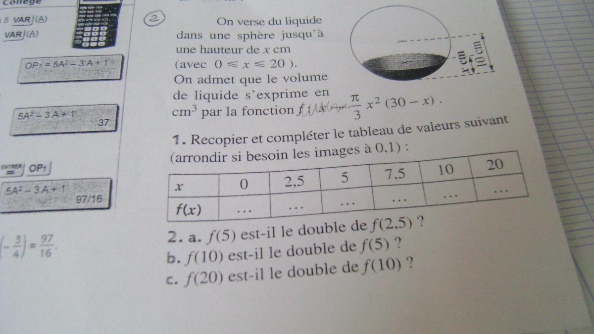 E-Bahut Barbidoux Posté(e) le 11 septembre 2011 E-Bahut Signaler Posté(e) le 11 septembre 2011 Il n'y arien à comprendre. Il faut apprendre ton cours et ce qu'est l'image et l'antécédent d'une fonction. Ce sont des définitions… f(x) est l'image de x f(x)=Pi*x^2*(30-x)/3 Donc pour calculer f(0) tu remplaces x par o dans son expression ce qui te donne : f(0)=Pi*0^2*(30-0)/3=0 f(2,5)=Pi*(2,5)^2*(30-2,3)/3=179,99 etc...