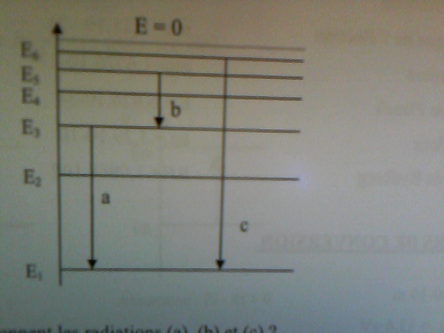 ojofifi Posté(e) le 25 septembre 2011 Signaler Posté(e) le 25 septembre 2011 Le diagramme ci dessous illustre la disposition relative des 6 premiers niveaux d'énergies de l'atome d'hydrogène dans le monde de bohr.Soit En l'énergie du niveau n.Pour un atome isolé on donne E2 = -5,436*10-19 J. 1) On me demande de calculer E3,E5 et E6 en joules et en eV. 2) Les 3 transitions électroniques (a),(b) et © correspondent à l'émission de 3 radiations par un atome de H isolé. Calculer a,bet c. voir graphique ci joint 3) A quel domaine appartiennent les radiations (a),(b) et © ? Pour la 1 j'ai trouvé E3 =-13,6*(1/9)= -1,51 es ce correcte ? En=-k(z²/n²) es ce la bonne formule à utiliser?