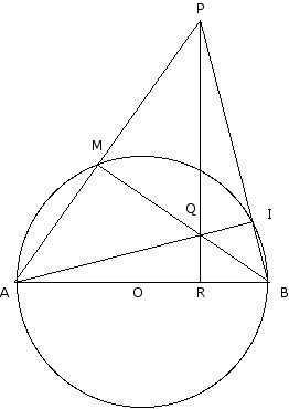 E-Bahut Barbidoux Posté(e) le 2 octobre 2011 E-Bahut Signaler Posté(e) le 2 octobre 2011 On considere un cercle C de centre O et de diametre [AB] et R un point de ce diametre , Par R, on trace (∆) la perpendiculaire a (AB) Soit M un point de C,(∆) coupe (BM) en Q et (AM) en P, Soit I le point d'intersection en (PB) et ( AQ), Le but de cet exercice est de montrer que I est un point du cercle C, 1) Faire une figure 2) Quelle est la nature du triangle ABM ? Rectangle en M (inscrit dans un cercle ayant un des côtés, l'hypoténuse, comme diamètre) 3) Que représente le point P pour le triangle ABQ ?Justifiez Orthocentre point de concours de QR hauteur issue de Q perpendiculaire par construction à AB et AM hauteur issue de A perpendiculaire à QB 4) En déduire que (BP) et (AQ) sont perpendiculaires AI est la troisième hauteur du triangle AQB et AI et BP sont perpendiculaires 5) Finir l'exercice Q est l'orthocentre du triangle APB