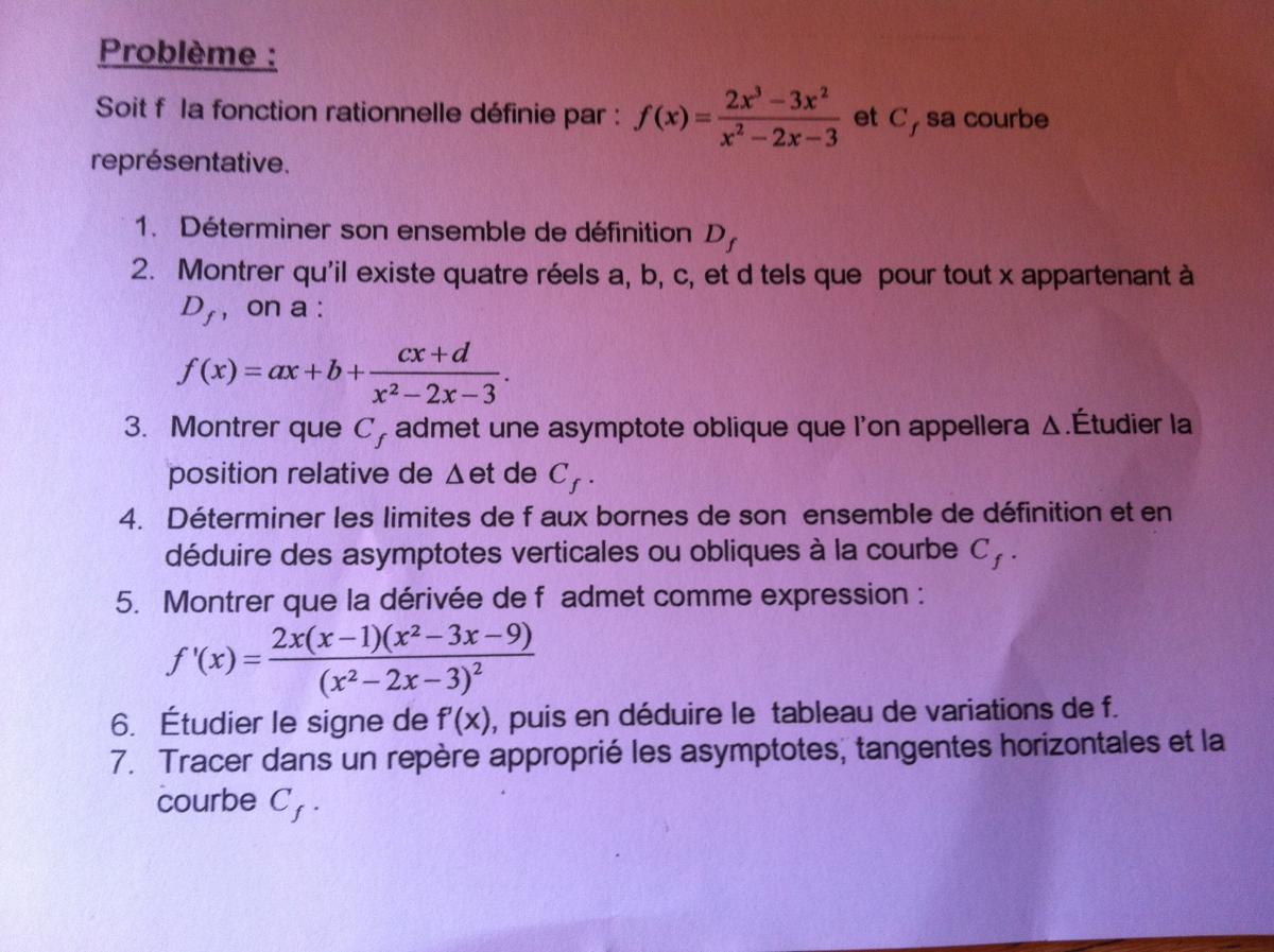 E-Bahut Barbidoux Posté(e) le 7 octobre 2011 E-Bahut Signaler Posté(e) le 7 octobre 2011 1--------------------- f(x)=(2*x^3-3*x^2)/(x^2-2*x-3) Le polynôme x^2-2*x-3 admet deux racines x=-1 et x=3 donc domaine de définition R\{1 et -3} 2--------------------- Division de polynôme f(x)= (2*x^3-3*x^2)/(x^2-2*x-3) =2*x+1+(8*x + 3)/(x^2-2*x-3) 3--------------------- Lorsque x-> ∞ alors f(x)≈2*x+1 -> ∞ et y=2*x+1 est asymptote au graphe de f(x). Comme f(x)-y=(8*x + 3)/(x^2-2*x-3)≈ 8/x=0+ le graphe de f(x) tend vers son asymptote par valeurs supérieures Lorsque x-> -∞ alors f(x)≈2*x+1 -> -∞ et y=2*x+1 est asymptote au graphe de f(x). Comme f(x)-y=(8*x + 3)/(x^2-2*x-3)≈ 8/x=0- le graphe de f(x) tend vers son asymptote par valeurs inférieures 4--------------------- Lorsque x-> -1+ alors f(x)=(2*x^3-3*x^2)/((x-1)*(x+3)))=-5/0+ -> -∞ Lorsque x-> -1- alors f(x)=(2*x^3-3*x^2)/((x-1)*(x+3)))=-5/0- -> ∞ asymptote verticale d'équation x=-1 ---------- Lorsque x-> 3+ alors f(x)=(2*x^3-3*x^2)/((x-1)*(x+3)))=27/0+ -> ∞ Lorsque x->3- alors f(x)=(2*x^3-3*x^2)/((x-1)*(x+3)))=27/0- -> -∞ asymptote verticale d'équation x=3 5--------------------- f'(x)=(6 x^2 + 6 x)/(x^2 - 2 x - 3) - ((2 x - 2) (2 x^3 + 3 x^2))/(x^2 - 2 x - 3)^2=(2 x (x^3 - 4 x^2 - 12 x - 9))/(x^2 - 2 x - 3)^2 Le polynôme (x^3 - 4 x^2 - 12 x - 9) admet 1 comme racine donc se met sous la forme (x-1)*(x^2+b*x+9) en identifiant les termes de même degré on obtient b=-3 et f'(x)=2*x*(x-1)*(x^2-3*x+9)/(x^2 - 2 x - 3)^2 6--------------------- Le polynôme (x^2-3*x+9) admet deux racines x=3*(1-√5)/2 et x=3*(1+√5)/2 et est du signe >0 à l'extérieur de ses racines x.................................3*(1-√5)/2..................-1.................0....................1.....................3..........3*(1+√5)/2........... 2*x.................(-)..............................(-)......................(-).....(0).......(+).............(+)...............(+).......................(+)....... (x-1)..............(-)...............................(-).....................(-)..................(-).....(0)...(+)................(+)......................(+)........ (x^2-3*x+9)....(+)...............(0).........(-)......................(-)..................(-).............(-)................(-)...........(0)........(+)....... f'(x).................(+)..............(0)..........(-)...........||.........(-).......(0).......(+)....(0)....(-)........||....(-)..........(0)........(+)...... f(x)...............crois.............Max......decrois....||....decrois....Min....crois...Max..decrois.||..decrois...Min...crois..... 7---------------------