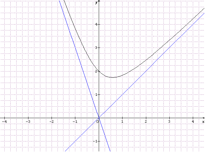 E-Bahut Papy BERNIE Posté(e) le 22 octobre 2011 E-Bahut Signaler Posté(e) le 22 octobre 2011 4) Le graph montre que la droite y=x est asymptote en +inf et la droite y=-3x est asymptote en -inf. OK ? f(x)-x=2V(1+x²)-2x lim [f(x)-x]=lim [2V(1+x²)-2x]=lim 2[|x|V(1/x²+1)-x] x-->+inf Quand x tend vers +inf , alors |x|=x donc : lim [f(x)-x]=2[x(V(1/x²+1)-1)] x-->+inf lim V(1/x²+1)-1=V1-1=0 x-->+inf Par produit : lim [f(x)-x]=0 x-->+inf ce qui prouve que la droite D d'équation : y=x est asymptote à Cf en +inf. f(x)-(-3x)=2V(1+x²)-x+3x=2V(1+x²)+2x lim [f(x)-(-3x)]=lim [2V(1+x²)+2x]=lim 2[ |x|*V(1/x²+1)+x] x-->-inf Ici , x < 0 donc |x]=-x lim [f(x)-(-3x)]=lim 2[ -x*V(1/x²+1)+x] x-->-inf lim [f(x)-(-3x)]=lim 2x[ 1-V(1/x²+1)] x-->-inf lim [1-V(1/x²+1)]=1-V1=0 x-->-inf Par produit : lim [f(x)-(-3)]=0 x-->-inf ce qui prouve que la droite D' d'équation : y=-3x est asymptote à Cf en -infini.