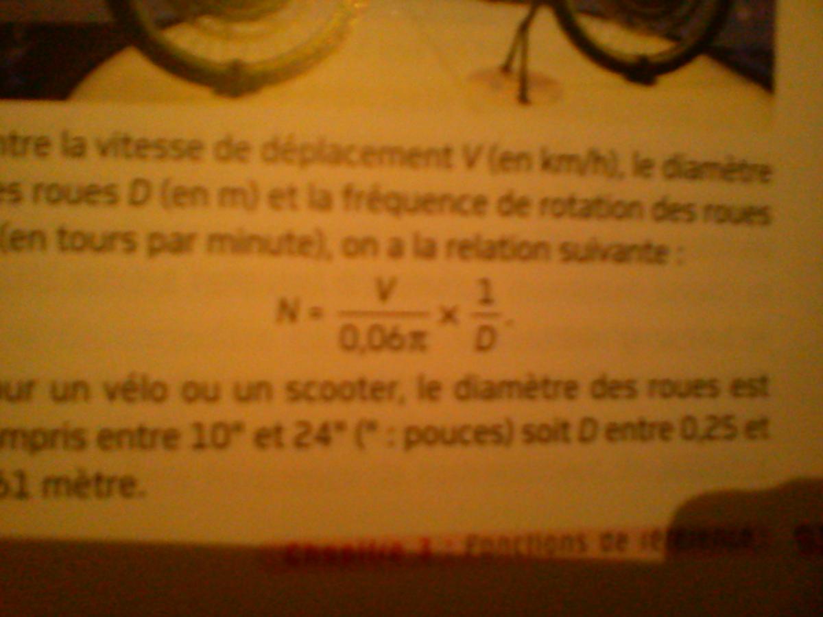 E-Bahut Barbidoux Posté(e) le 22 novembre 2011 E-Bahut Signaler Posté(e) le 22 novembre 2011 Bonjour a tous ! Alors voilà je n'arrive pas du tout a faire un exercice pour mon dm si vous pouviez m'aider ça serai sympa ! Enoncé : Lors de la conception d'un cycle motorisé se déplaçant sur route , on impose une vitesse de déplacement et on cherche à déterminer le système motorisation-transmission-roues permettant ce déplacement. Dans les nouveaux cycles électriques, le moteur est directement intégré dans la roue: la vitesse de rotation de la roue est donc celle du moteur. Entre la vitesse de déplacement V ( en km/h ) , le diamètre des roues D ( en m ) et la fréquence de rotation des roues N ( en tours par minute ), on a la relation suivante : N = V % 0,06 ( pi ) x 1% D