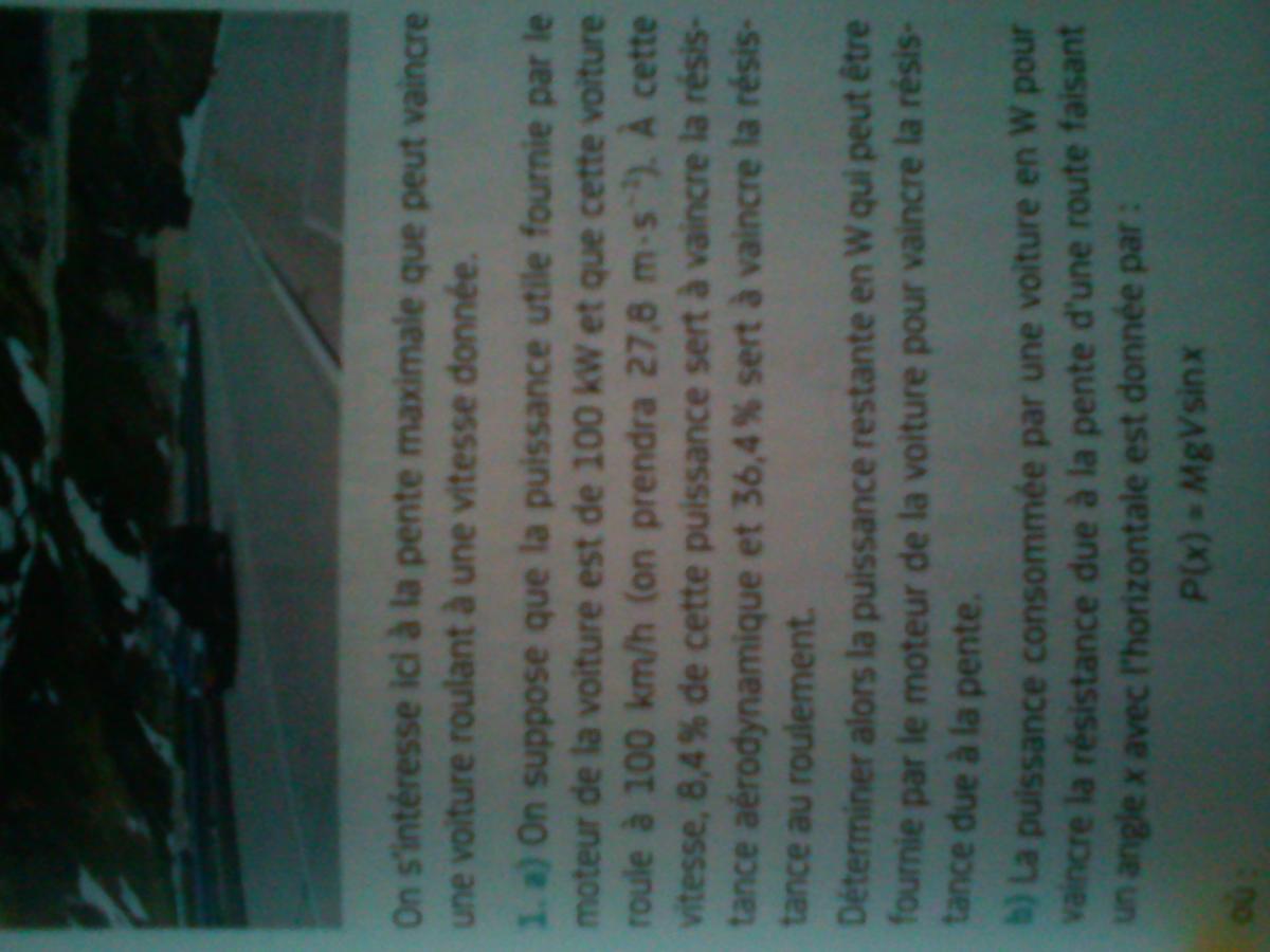 E-Bahut Barbidoux Posté(e) le 7 décembre 2011 E-Bahut Signaler Posté(e) le 7 décembre 2011 1a------------ P=100-8.4-36.4=55.2 kW=55200 W 1b------------ alpha= ArcSin(P/(m*g*V))=ArcSin[(100 - 8.4 - 36.4)*10^3/(1000*9.81*27.8)]*180/Pi=11,7° 2------------- P=100 - 1 - 18.2=80.8 kW=80800 W ArcSin[(100 - 1 - 18.2)*10^3/(1000*9.81*13.9)]*180/Pi=36.3° 3-------------- Non la relation entre alpha et V alpha= ArcSin(P/(m*g*V)) n'est pas une relation de proportionnalité