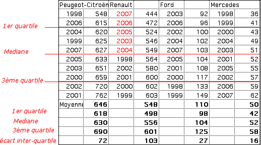 E-Bahut Barbidoux Posté(e) le 12 décembre 2011 E-Bahut Signaler Posté(e) le 12 décembre 2011 Le tableau ci-dessous référence le nombre d'immatriculations , en milliers , de nouveaux véhicules chaque année en France pour quatre grands constructeurs. Année : Peugeot-Citroën ( de 548 à 627 ) Renault ( 564 à 444 ) Ford ( 133 à 103 ) Mercedes ( 36 à 62 ) La première chose est de créer avec un tableur un tableau permettant de traiter indépendamment la production de voiture de chaque constructeur a) Déterminer, à l'aide de la calculatrice, la moyenne des nouvelles immatriculations annuelles pour chacun des constructeurs. La statistique portant sur 10 année, la moyenne des nouvelles immatriculations annuelles pour chacun des constructeurs est égale à la sommes des des nouvelles immatriculations divisé par 10 (voit tableau ci-dessus) b) Déterminer la valeur médiane pour les deux marques françaises. La statistique portant sur 10 années, il faut classer les année de production selon un effectif croissant. La médiane correspond à la valeur moyenne de la cinquième et sixième meilleure année. c) Quelles années correspondent à des valeurs inférieures à la médiane chez Renault ? Interpréter . Les années 204 à 2077 ce qui dénote un diminution effective et régulière des ventes de ce constructeur en France 2) a) Déterminer par le calcul l'écart inter-quartile de chaque constructeur. La statistique portant sur 10 années le premier quartile correspond à la moyenne de la seconde et troisième année de plus faible immatriculation le troisième quartile à la moyenne de la septième et huitième année de plus faible immatriculation. Voir tableau ci-dessus b) Les immatriculations pour l'année 2008 étaient : 633 000 pour Peugeot-Citroën , 449 000 pour Renault ; 112 000 pour Ford ; 51 000 Pour Mercedes . Peut-on parler de crise dans les ventes de voitures chez ces constructeurs ? Argumenter. Non le niveau des ventes à l'exception de Renault se situe au voisinage de la moyenne des ventes calculée sur les dix dernières années. Quel constructeur a réalisé la meilleure année 2008 parmi les quatre ? . Ford dont la valeur des ventes en 2008 est nettement supérieur à la médiane des dix dernières années.