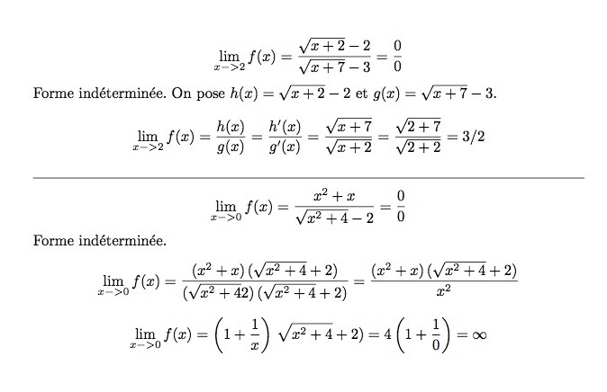 E-Bahut Barbidoux Posté(e) le 2 janvier 2012 E-Bahut Signaler Posté(e) le 2 janvier 2012 Sans être désagréable ces techniques sont du niveau de 1ère? parce que je suis en 1ère. Je ne connais pas en détail le programme de première mais si l'on te donne des études de limites conduisant à des formes indéterminées c'est que tu as du voir en cours les méthodes ou techniques permettant de lever ces indéterminations. La forme 0/0 est assez particulière et dans les cas où l'utilisation des formes conjuguées des numérateurs et dénominateurs n'aboutit pas il est recommandé d'utiliser la techniques des accroissement ou nombres dérivés des numérateurs et dénominateurs connue sous le nom de règle de l'Hôpital. Il y a peut être une autre méthode pais pour la première limite je n'ai pas trouve plus simple. Mais je comprend toujours pas comment tu as fais pour trouver h'(x) et g'(x) h(x)=√(x+2)-2 ==> h'(x)=1/(2*√(x+1)) g(x)=√(x+7)-3==>g'(x)=1/(2*√(x+7)) ==> lorsque x->2 lim(h(x)/g(x))=lim(h'(x)/g'(x))=√(x+7)/√(x+2)=√(9/4)=3/2