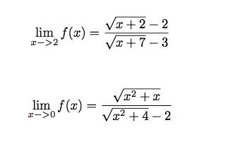 j-l Posté(e) le 2 janvier 2012 Auteur Signaler Posté(e) le 2 janvier 2012 Non ce n'est pas celle là pour la a) en numérateur racine carrée de x+2 -2 ( le -2 n'est pas sous la racine carrée) et au dénominateur racine carrée de x+7 -3 (le -3 n'est pas sous la racine carrée). Limite en 2 pour le b) en numérateur x²+x et en dénominateur racine carrée de x²+4 -2 (le -2 n'est pas sous la racine). Limite en 0 Voilà si tu as compris remontre moi les expressions et je te dirais si c'est bien cela.
