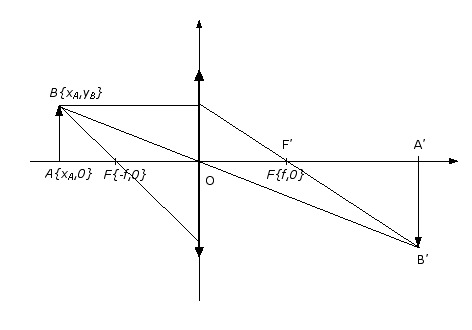 E-Bahut Barbidoux Posté(e) le 2 janvier 2012 E-Bahut Signaler Posté(e) le 2 janvier 2012 On considère un repere orthonormé d'origine O selon le schéma, dans lequel les foyers F et F' ont respectivement pour coordonnées (-f;0) et (f;0). Le point A n'est pas placé en O : xA =/ 0 1) Justifier que la droite (OB) a pour équation réduite : y = (yB / xA) * x La droite OB passe par l'origine son équation réduite est de la forme y=a*x ou a est la pente de la droite qui vaut yB/xA ==> y=(yB/xA)*x 2) En remarquant que le vecteur v(FB) a pour coordonnées (f + xA ; yB) , déterminer une équation cartésienne de la droite (BF) L'équation réduite de le droite BF a pour expression y=a*x+b ou a et b sont des constantes dont on détermine la valeur en écrivant que la droite passe par B yB=a*xA+b et par F yF=0=-f*a+b ==> b=f*a ==> yB=a*xA+b=yB=a*xA+f*a=(xA+f)*a ==> a=(yB/(xA+f)) et b=f*yB/(xA+f) ==> y=(yB/(xA+f))*x+f*yB/(xA+f)=(yB/(xA+f))*(x+f) Déterminer l'ordonnée à l'origine de la droite (BF) L'ordonnée à l'origine de la droite (BF) vaut xB'=f*yB/(xA+f) 3) En déduire les coordonnées du point B' puis du point A' en fonction de f, xA et xB. xA' est l'abscisse du point B' de coordonnée xB' ==> f*yB/(xA+f)=(yB/xA)*xA' ==> xA'=f*xA/(xA+f) et B'{f*yB, f*yB/(xA+f)} 4) Justifier la "relation de conjugaison" pour une lentille convergente : (1/xA')- (1/xA)= (1/f ) (1/xA')- (1/xA)=(xA+f)/(f*xA)-1/xA=(xA+f-f)/(f*xA)=1/f