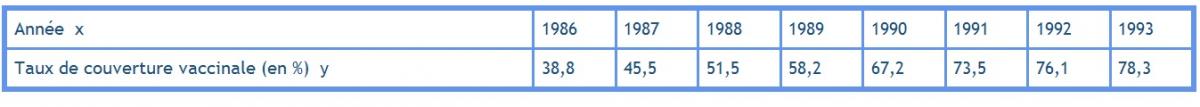 Su Princess Posté(e) le 4 janvier 2012 Signaler Posté(e) le 4 janvier 2012 Bonsoir Je n'ai pas réussi à construire une équation. Pourriez-vous, s'il vous plait, me dire dans quelle étape j'ai eu faux? Voici les donnés en fichier joint On a ajouté une donnée, en 1994 d'où le taux de couverture vaccinale était de 80,5% A partir de cette donnée et de la 1er donnée du tableau (1986;38,8), il faut déterminer une équation. Voici ce que j'ai fait: La droite passe par (1986;38,8) et (1994;80,5). Son équation est de la forme:y=mx+p On a donc:38,8=m*1986+p et 80,5=m*1994+p Soit: p=38,8-m*1986 et 80,5=m*1994+38,8-m*1986=8*m+38,8 Ce qui donne: m=(80,5-38,8)/8=41,7/8 (là je n'arrive pas à réduire sous un dénominateur plus petit, mais je pense que c'est le maximum) et p=38,8-(41,7/8)*1986=71297,4 L'équation de la droite est donc:y=41,7/8x-71297,4 Mais lorsque j'utilise une année, par exemple 1992, ça ne donne pas son taux de couverture vaccinal correctement. Comment ça ce fait? J'ai pourtant suivi toutes les étapes.