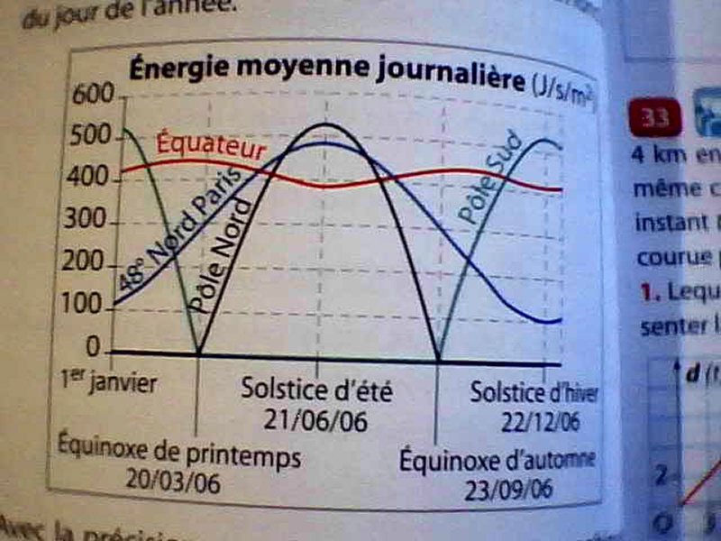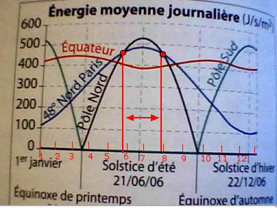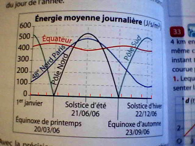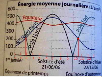 E-Bahut Barbidoux Posté(e) le 30 septembre 2012 E-Bahut Signaler Posté(e) le 30 septembre 2012 Ce graphique représente l'énergie solaire journalière moyenne reçue hors de l'atmosphère en fonction du jour de l'année . Avec la précision permise par une lecture graphique , Il faut diviser l'axe des abscisses en 12 (12 mois de l'année) déterminer : a) Quand l'énergie solaire journalière moyenne reçue au pôle Sud est la même que celle reçue à Paris ; 20 février et 15 Octobre b) Quand l'énergie solaire journalière moyenne reçue au pôle Nord est supérieure à celle reçue à Paris ; entre le 320 mai et le 20 juillet c) Quand l'énergie solaire journalière moyenne reçue au pôle Sud est supérieure à celle reçue sur l'équateur . entre le 15 Novembre et 30 Janvier